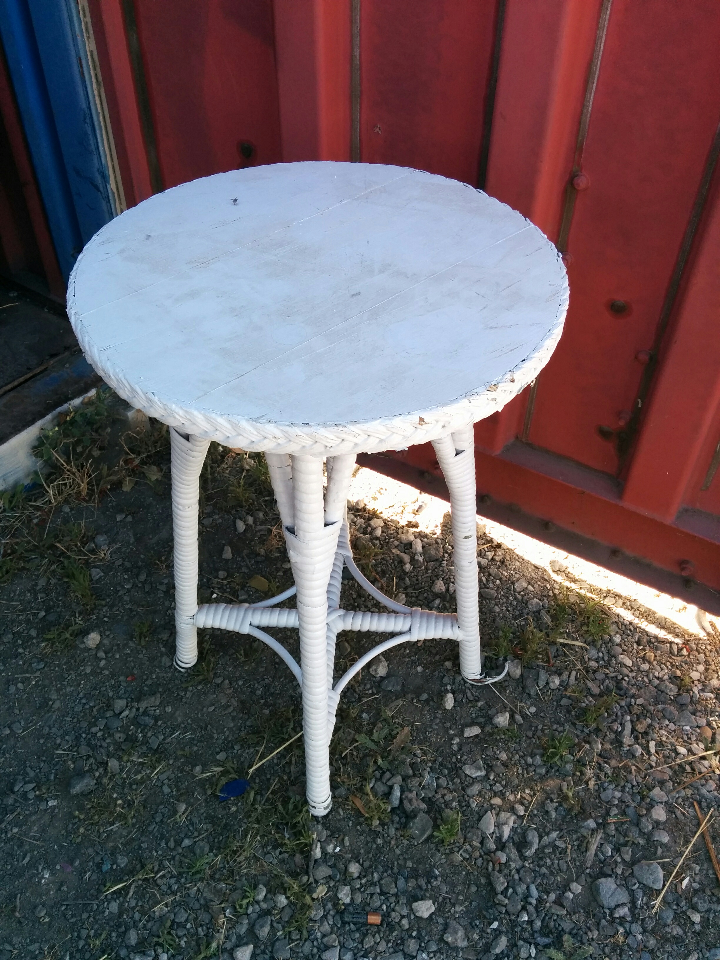 *SOLD* 0641 White Wicker Round Table SOLD Top is wood. some loose wicker at bottom of legs but sturdy. 28.5″T x 19″ Diameter Share this: Click to share on X (Opens in new window) X Click to share on Facebook (Opens in new window) Facebook Like Loading... Related
