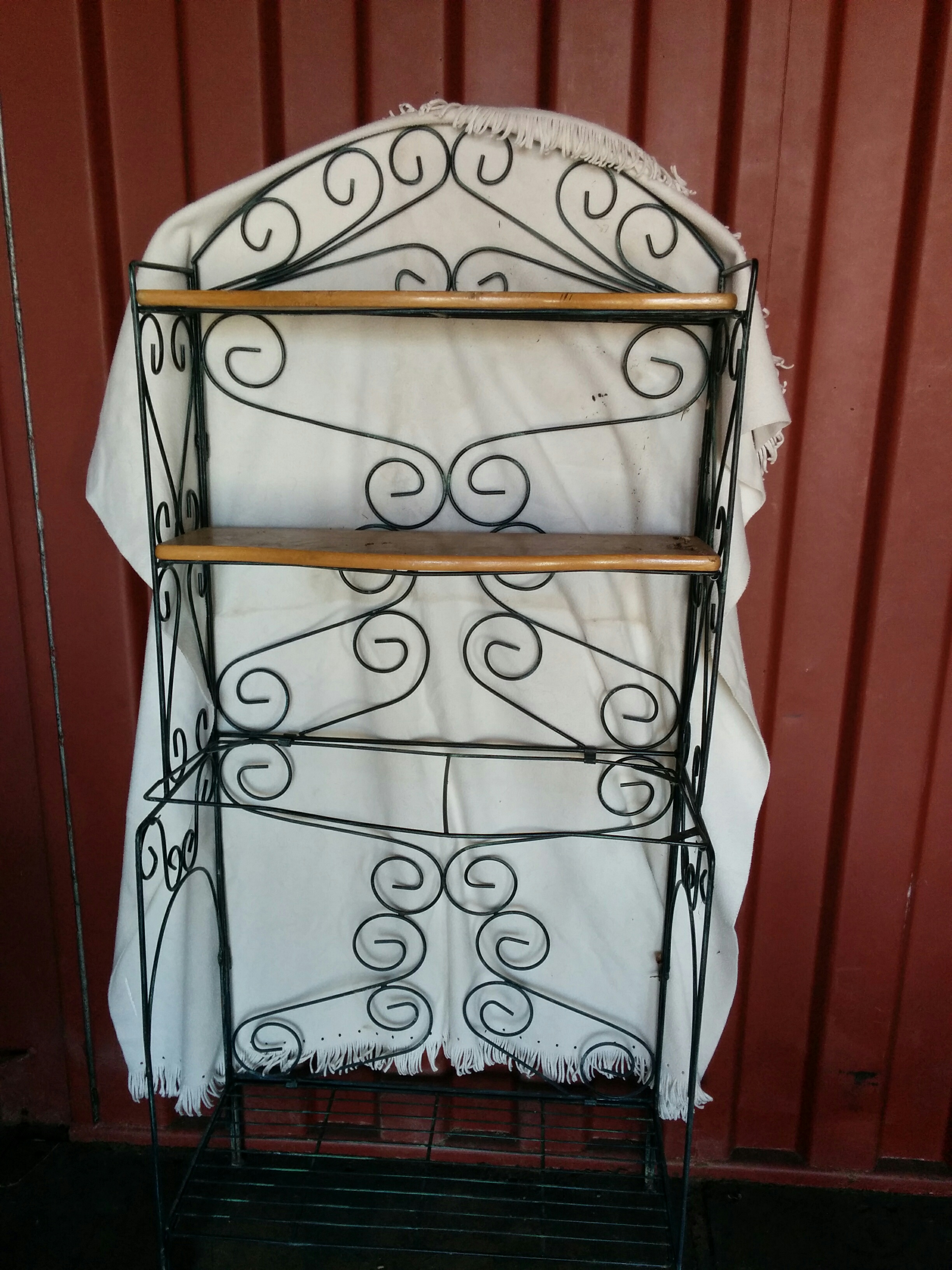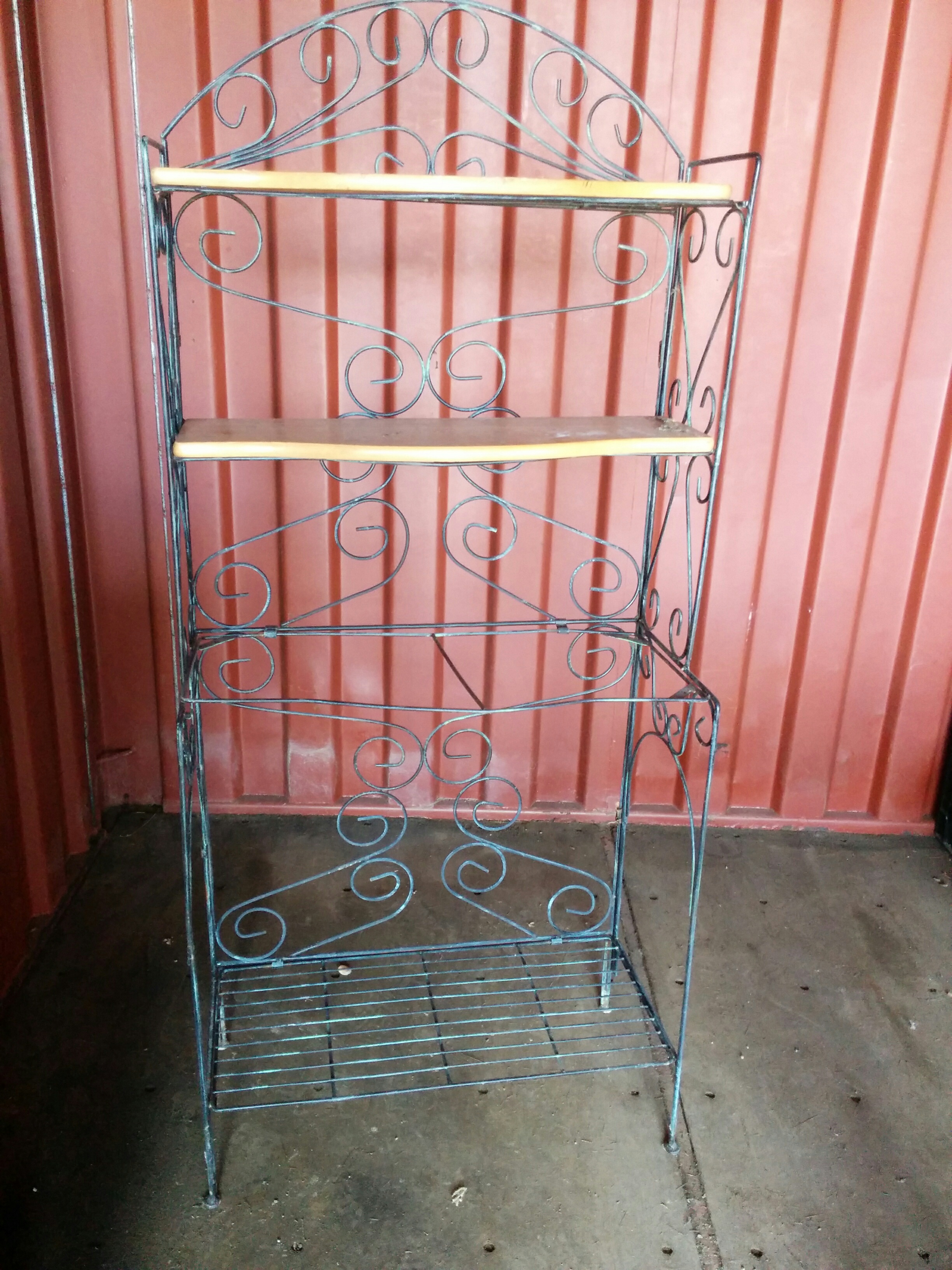 *SOLD* 0672 Baker’s Rack w Wood Shelves SOLD 64″H x 28″W – bottom wire shelf is 13″D – middle is missing the wood shelf (curved & 14″D) top shelves are 10″ D Share this: Click to share on X (Opens in new window) X Click to share on Facebook (Opens in new window) Facebook Like Loading... Related
