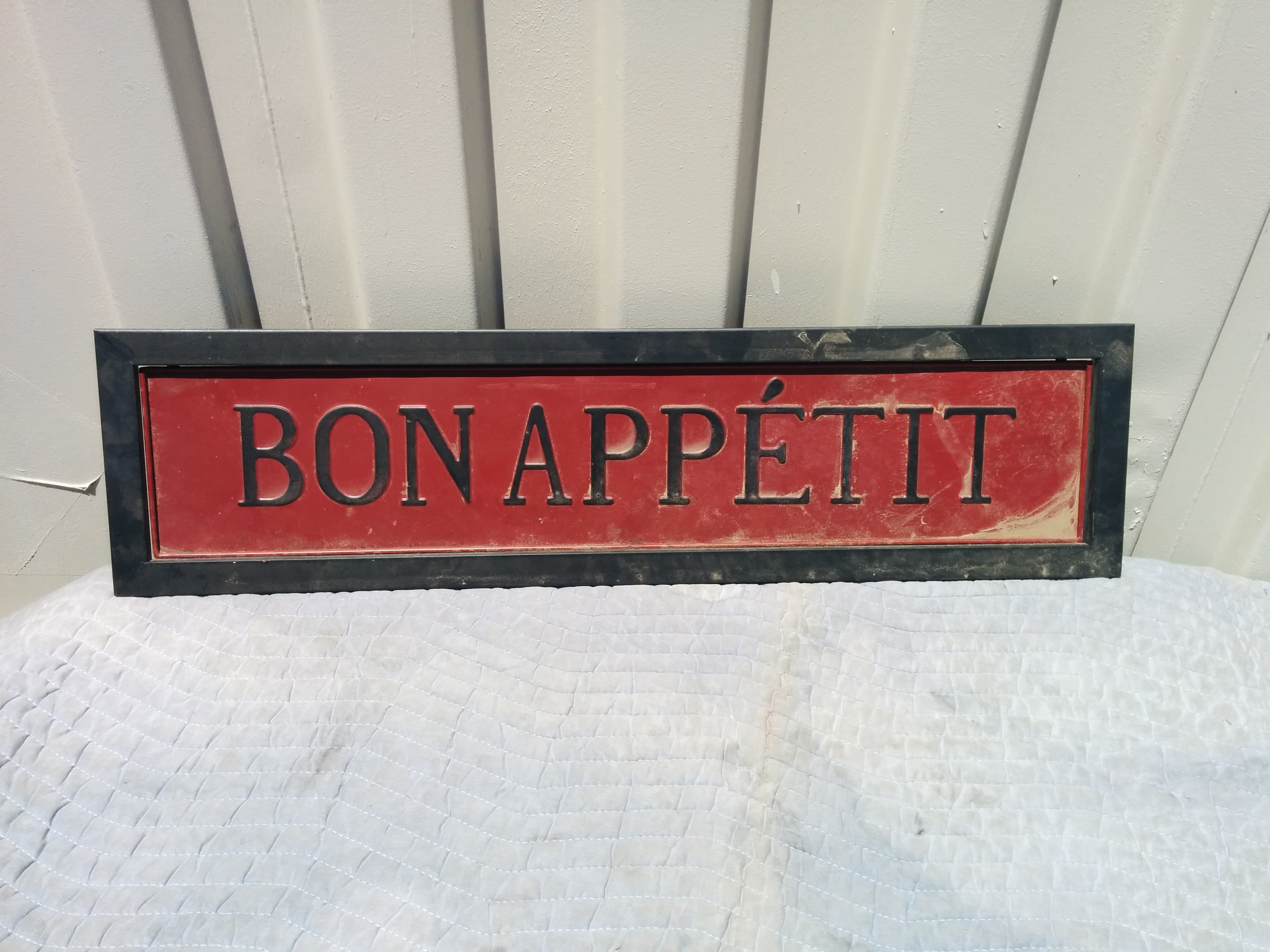 *SOLD* 0714 Metal Bon Appetit Sign SOLD 9.5″H x 36″ W. Just needs clean up. Share this: Click to share on X (Opens in new window) X Click to share on Facebook (Opens in new window) Facebook Like Loading... Related