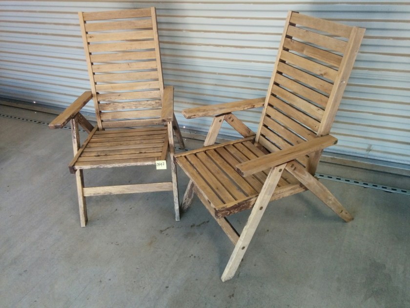 *SOLD* 0847 Pair of Folding Chairs SOLD 16″ H to seat + 27″ back – 23.5″W arm to arm – seat is 19″D. Wood seems to be sanded. Share this: Click to share on X (Opens in new window) X Click to share on Facebook (Opens in new window) Facebook Like Loading... Related