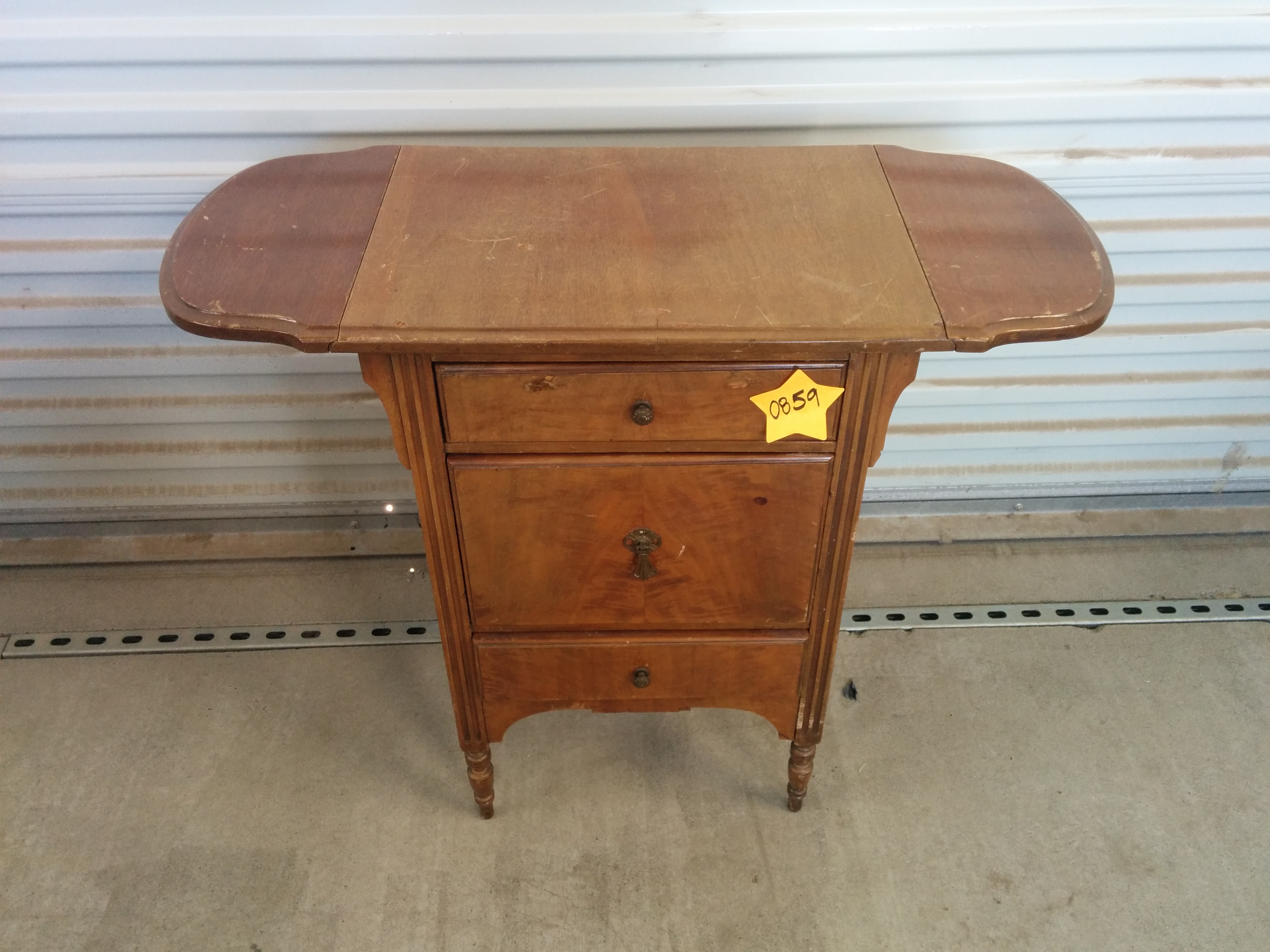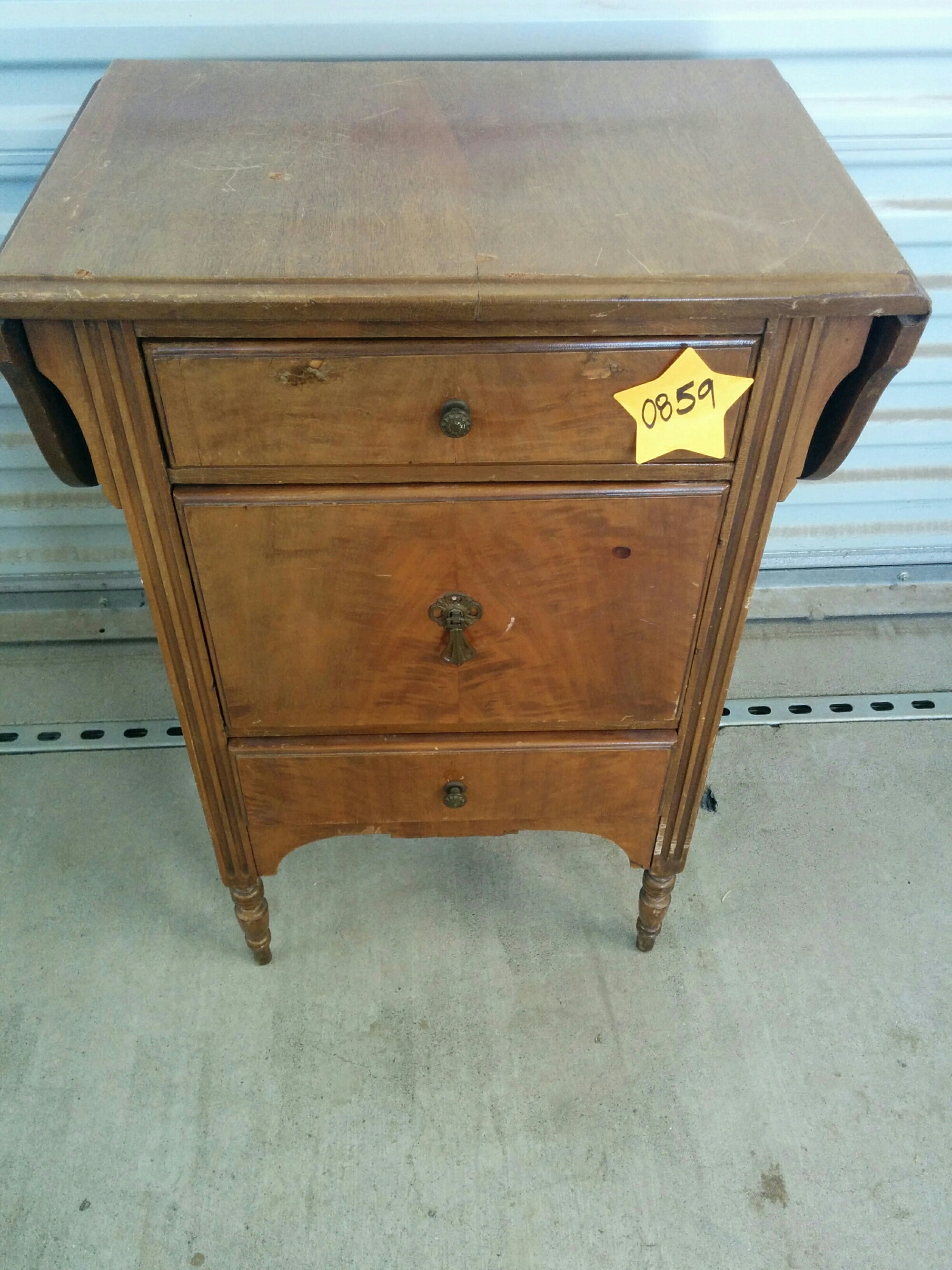 *SOLD* 0859 Small Cabinet with flip up side extensions SOLD Adorable table. Beautiful hardware. There is damage to the top laminate but table is wood. 29″ H x 19″ W+ each leaf extension is 7.5″ x 15″D Share this: Click to share on X (Opens in new window) X Click to share on Facebook (Opens in new window) Facebook Like Loading... Related