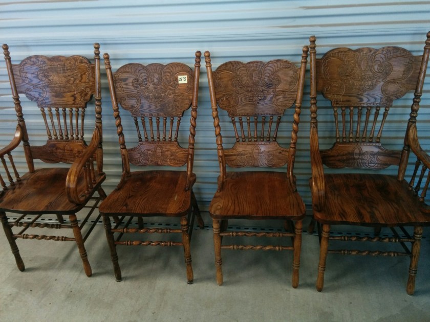 *SOLD* 0875 Four Oak Chairs SOLD Very good condition. No visible damage. 18.5″H to seat + 25.5 back on arm chair and 24″ back on regular chair. Forgot to measure width. Share this: Click to share on X (Opens in new window) X Click to share on Facebook (Opens in new window) Facebook Like Loading... Related