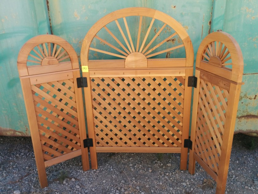 *SOLD* 0901 Sun Garden Divider SOLD break in side partition 3 sections- Large middle section is 57″H x 36″W – side sections are 51″H x 18″ W – top sun section a bit wobbly but you can unscrew it, glue it and re-screw it. Share this: Click to share on X (Opens in new window) X Click to share on Facebook (Opens in new window) Facebook Like Loading... Related