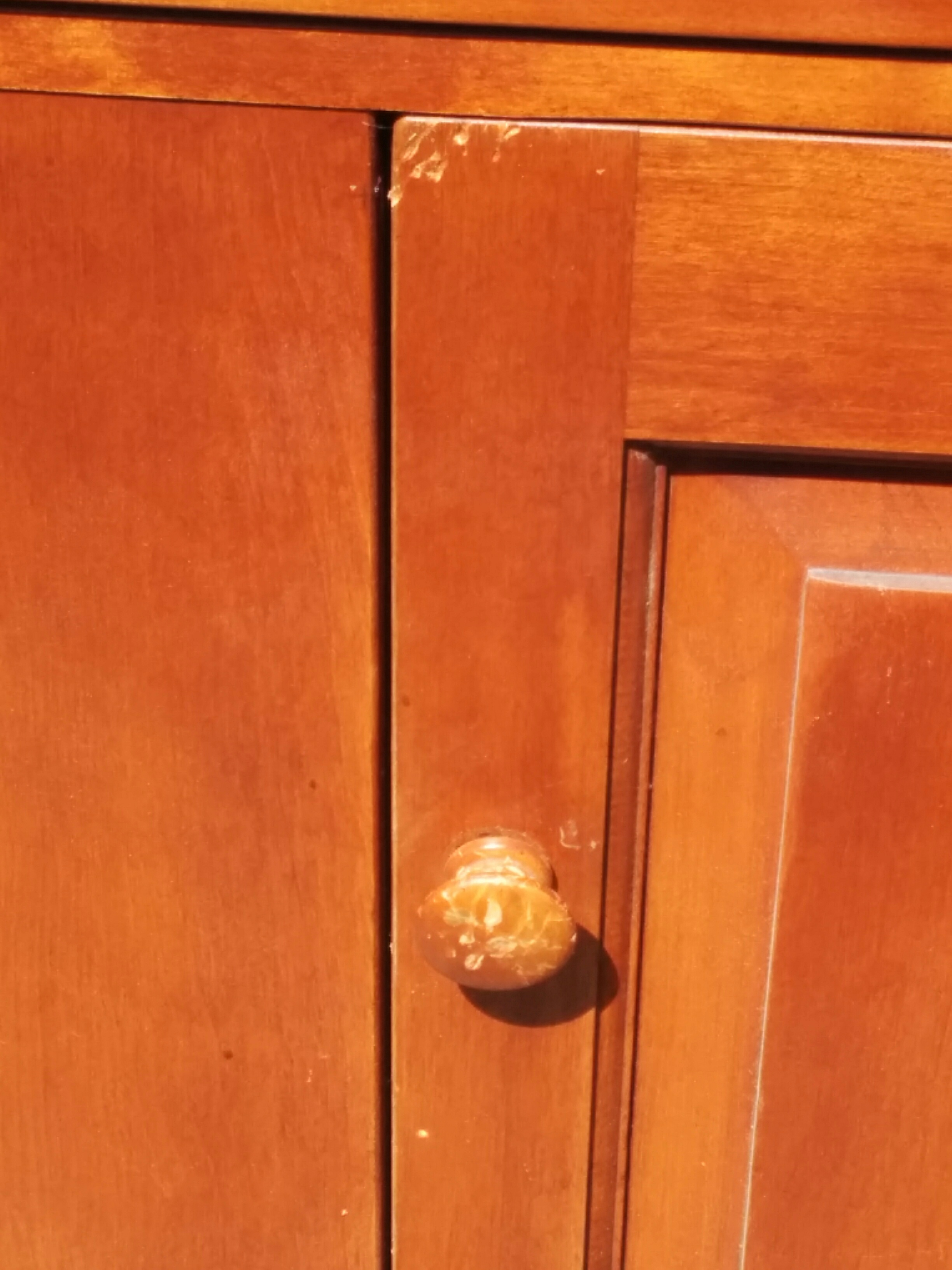 wp-1474329961260.jpgwp-1474329977046.jpgwp-1474329940729.jpgwp-1474329924613.jpgwp-1474329888820.jpg This has some superficial damage as you can see.  Some of it is inside the cabinet, the shelf and inside corner of the door.  The more visible stuff is on the door knob and top corner of the door.  It matches post 0914 Cushman Corner Cabinet.  Seems to have had a hutch at one point in time.