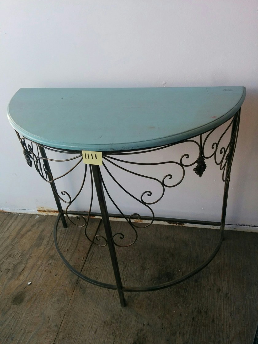 *SOLD* 1111 Half Circle Metal Table with Wood Top SOLD 28.5″H x 31″ W x 15″ D Share this: Click to share on X (Opens in new window) X Click to share on Facebook (Opens in new window) Facebook Like Loading... Related