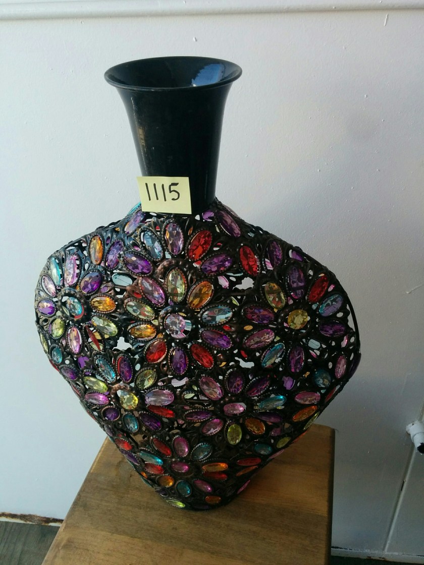 *SOLD* 1115 Pretty Decorative Vase Thing Haul, SOLD Missing some stones but not obvious. See if you can find where. Top is plastic. Strictly decorative. 23″H x 16″W approx 6″ D in middle section. Share this: Click to share on X (Opens in new window) X Click to share on Facebook (Opens in new window) Facebook Like Loading... Related