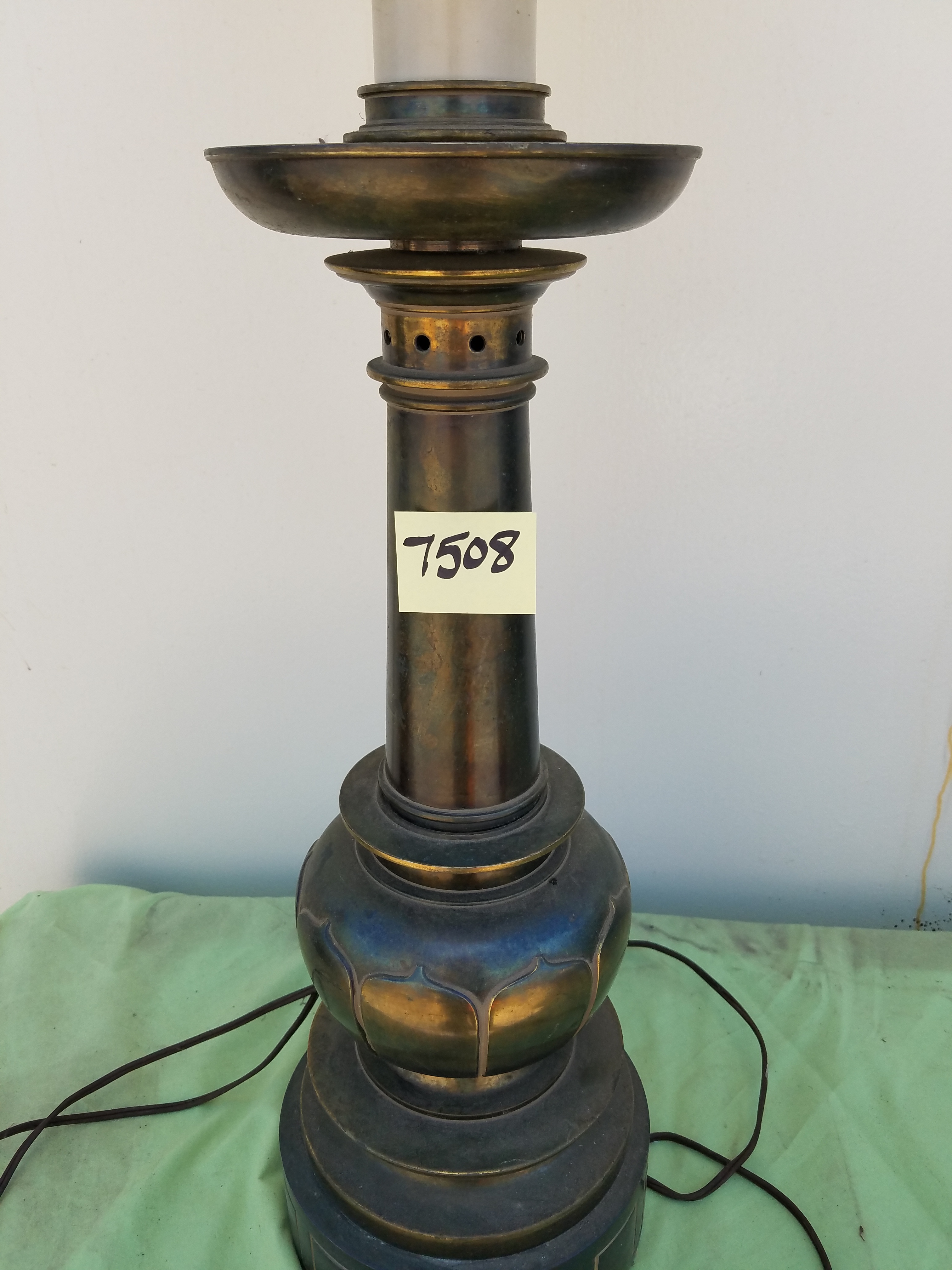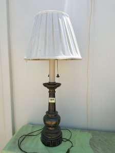 7508 Tall Metal Lamp Available Could be brass, not sure. The metal section is 20.5″H, overall lamp is 40″ tall. Base is 7.5″ Round at the bottom and 6″ round at the top. Needs new lampshade. Share this: Click to share on X (Opens in new window) X Click to share on Facebook (Opens in new window) Facebook Like Loading... Related