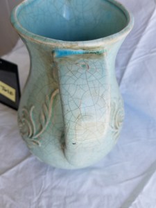 *SOLD* 7618 Decorative Light Blue Vase SOLD 11″H x 6″Oval opening x 7.5 ” W in the middle. Has crackle effect. Share this: Click to share on X (Opens in new window) X Click to share on Facebook (Opens in new window) Facebook Like Loading... Related