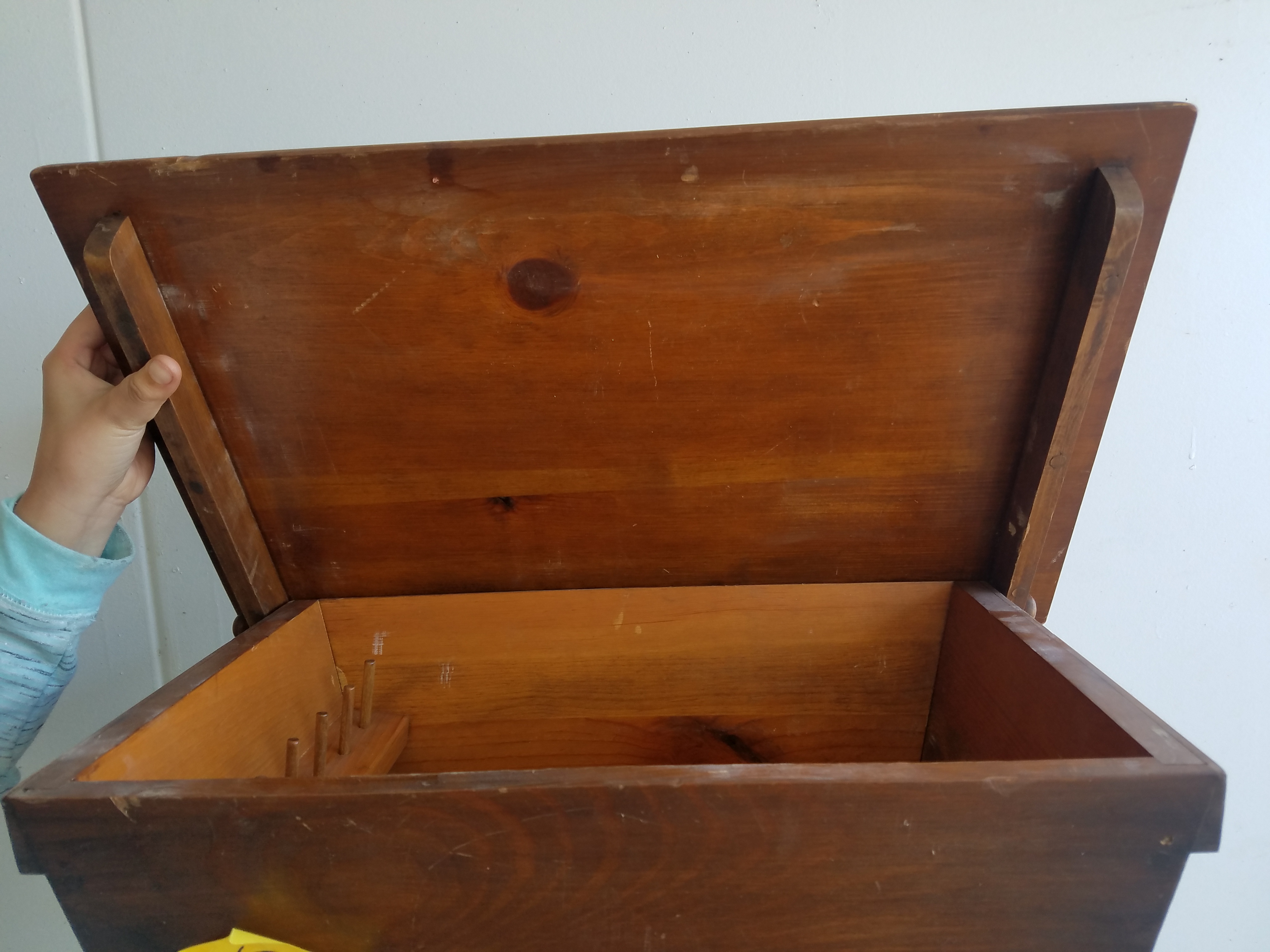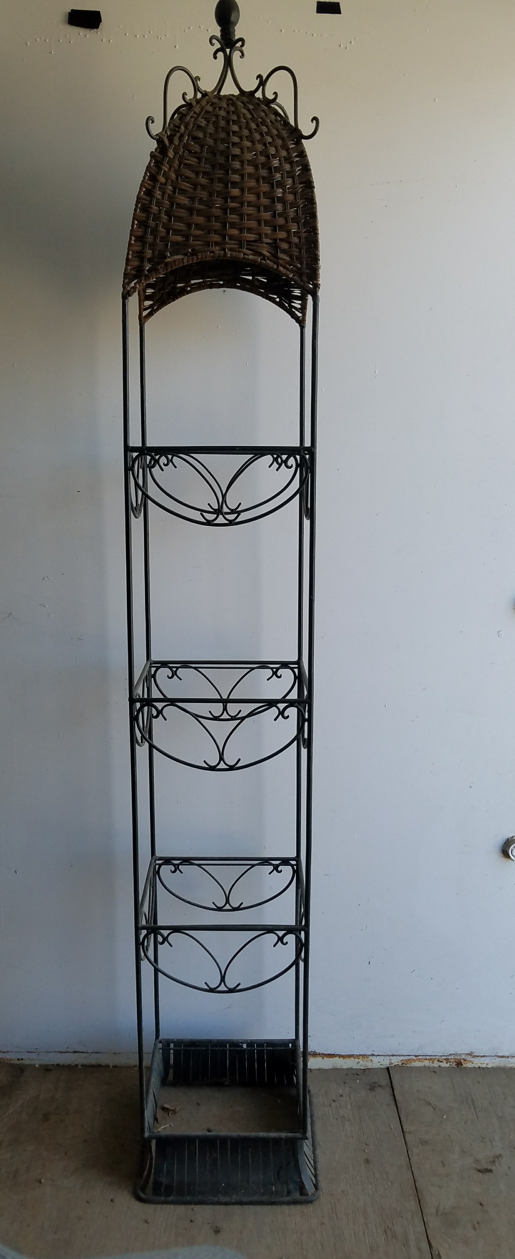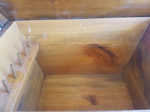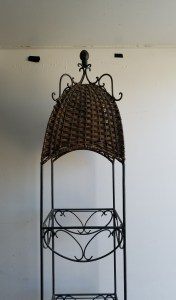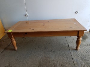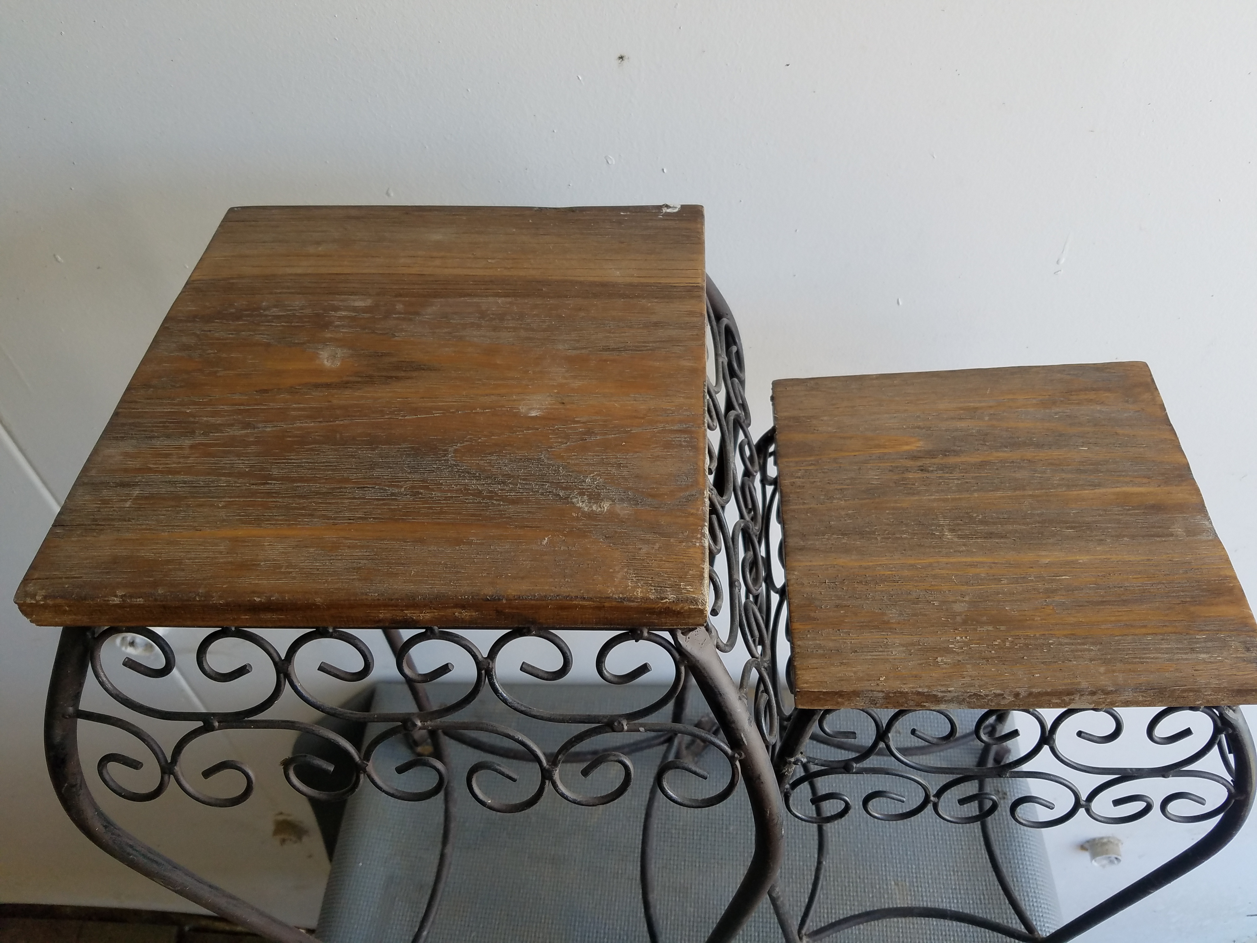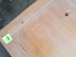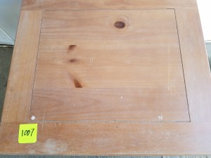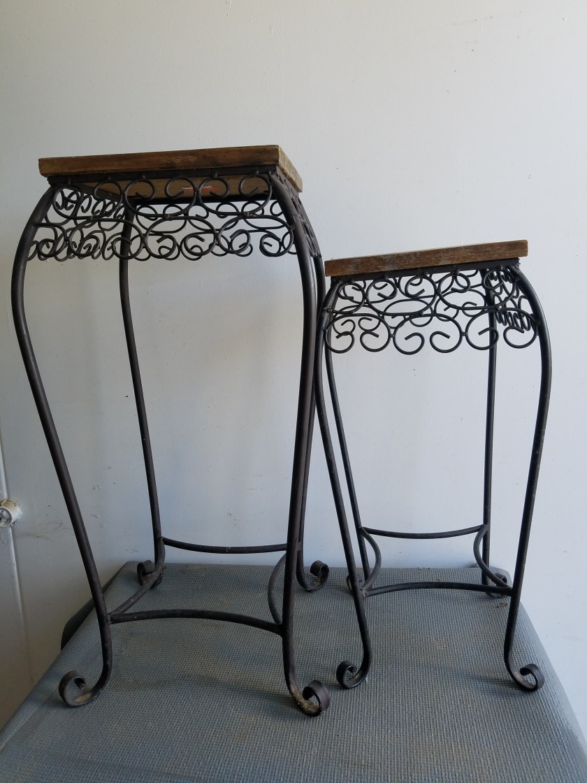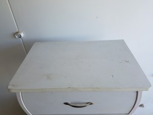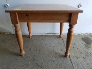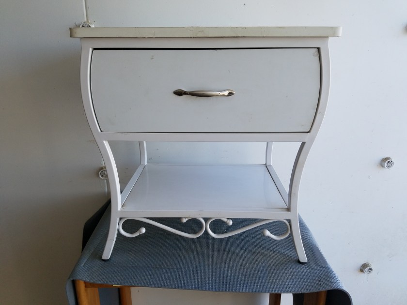 This is an interesting table. It is mostly metal with the top being some kind of laminate. The drawer has metal railings so it opens very smoothly. It is in decent shape. 23″H x 22″W x 15″D