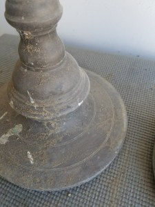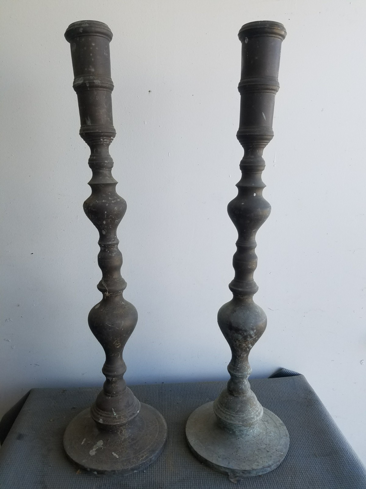 Very Dirty, need lots of buffing! I think they are candle holders because they are hollow. The one on the left seems a little bent. They do unscrew half way, not sure what the purpose is, travel or storage?