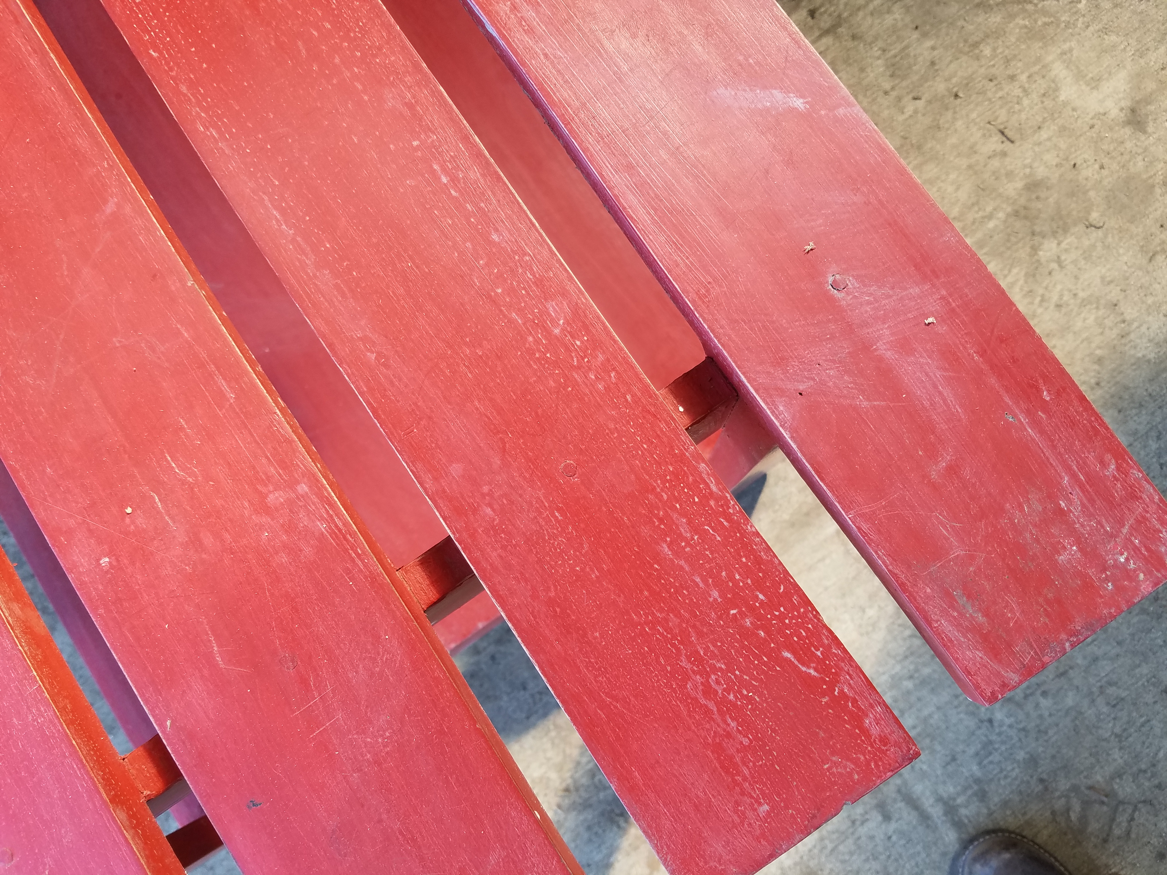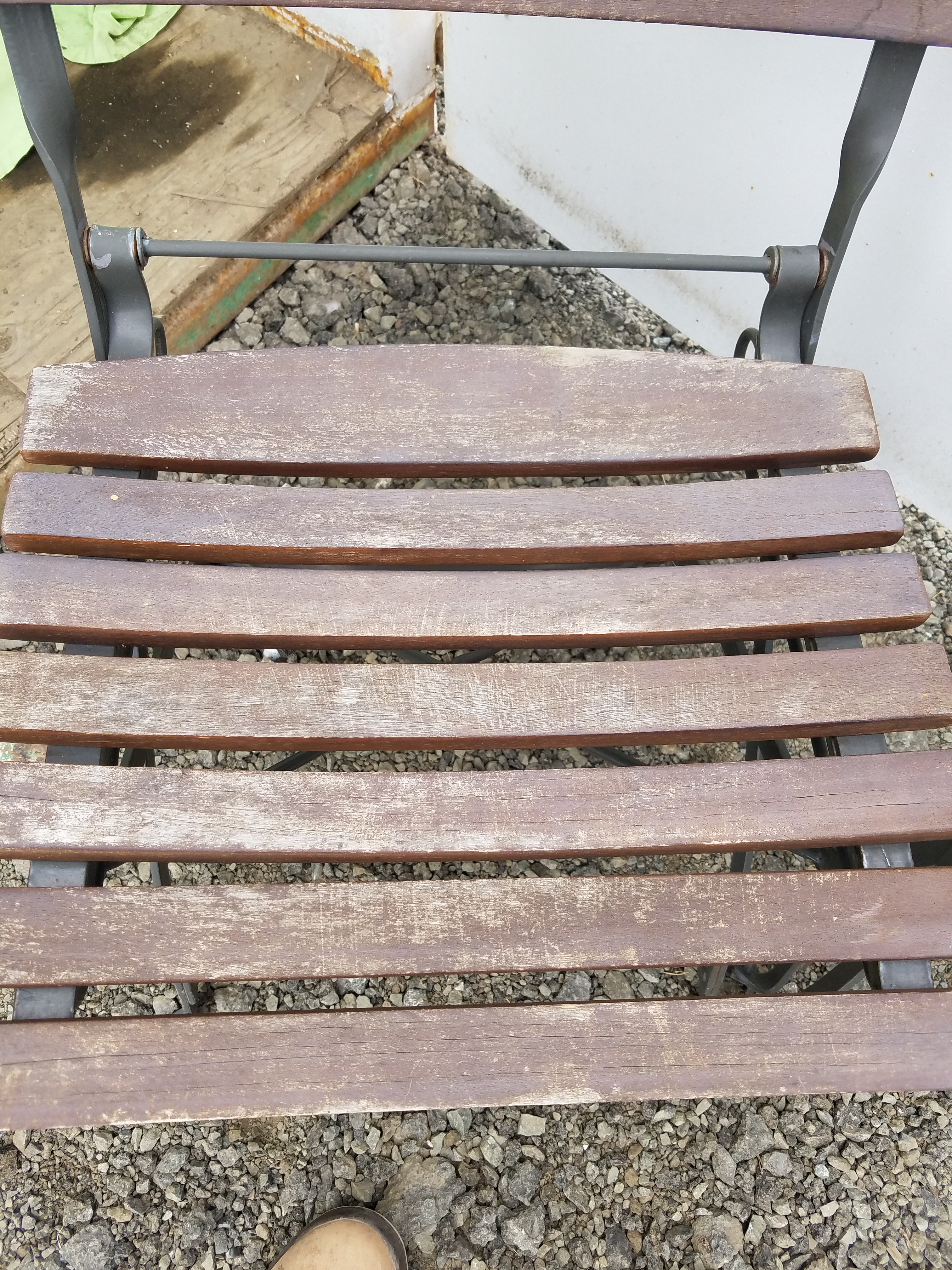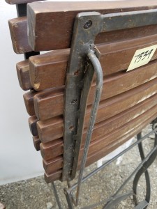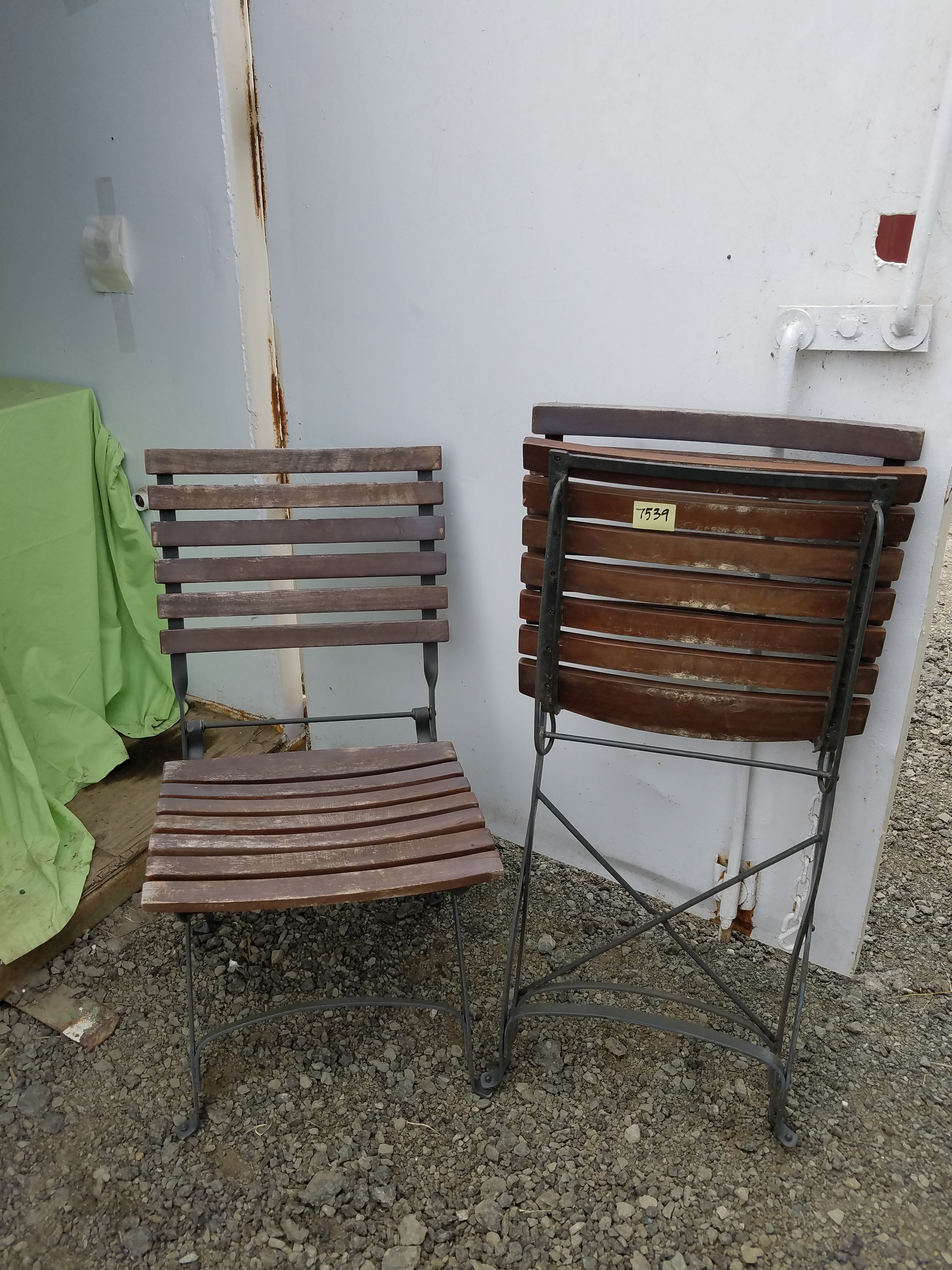 *SOLD* 7539 Pair of Outdoor Iron & Wood Slat Chairs Outdoor Stuff, SOLD Chairs are solid & heavy. 18″ H to seat + 20″ for the back. Seat is 18.5″W x 16″D