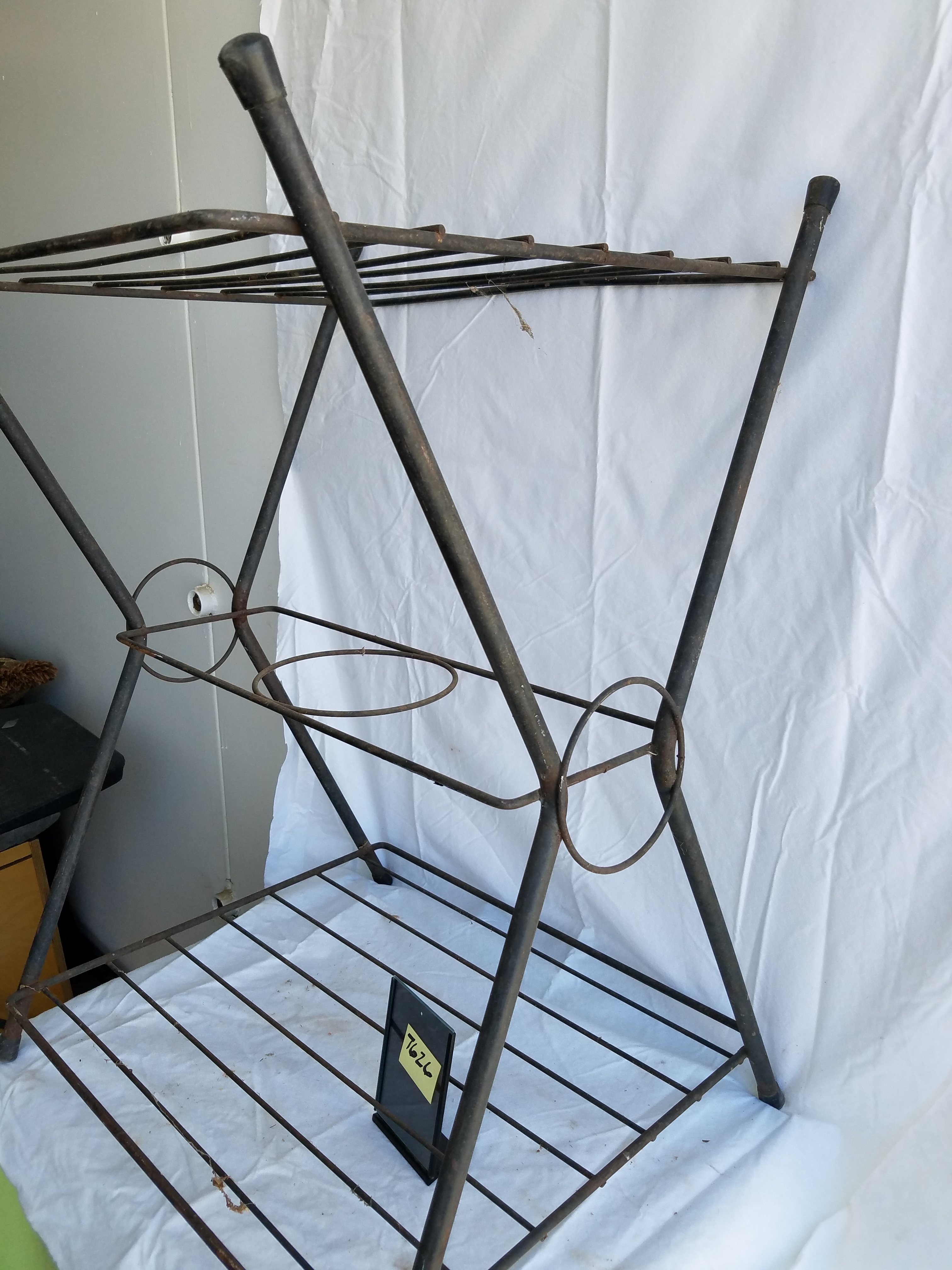 *SOLD* 7510 Corner Metal Shelves Outdoor Stuff, SOLD sold separately. Pot w tea spout is 9″H x 7″D. Blue coffee pot is 9″Hx8″D Shelves are 52″ H x 24″W.