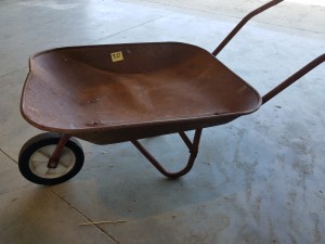 *SOLD* 7627 Old Rusty Metal Wheelbarrow Outdoor Stuff, SOLD Regular sized wheelbarrow. 19″H x 32″W x 24.5″D not including the handles. Has several dents but the wheel is good!!