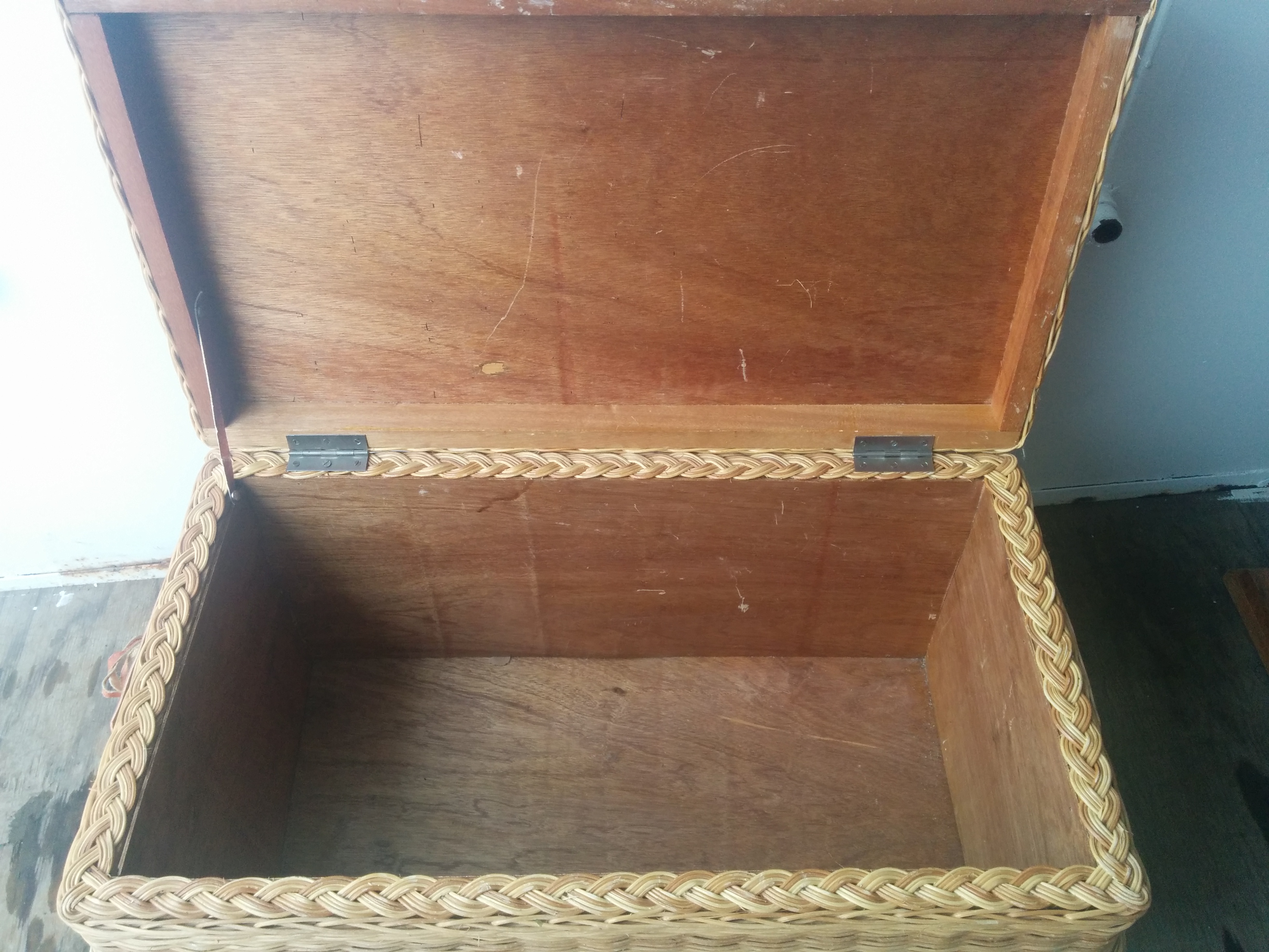 0936 Bubble Wicker Chest Dumped, SOLD Has cute “bubble” shape, the middle bumps out. Handles are missing. Inside is wood. Wicker is in decent shape, although there is some breakage. 18″H x 32″W x 18″D