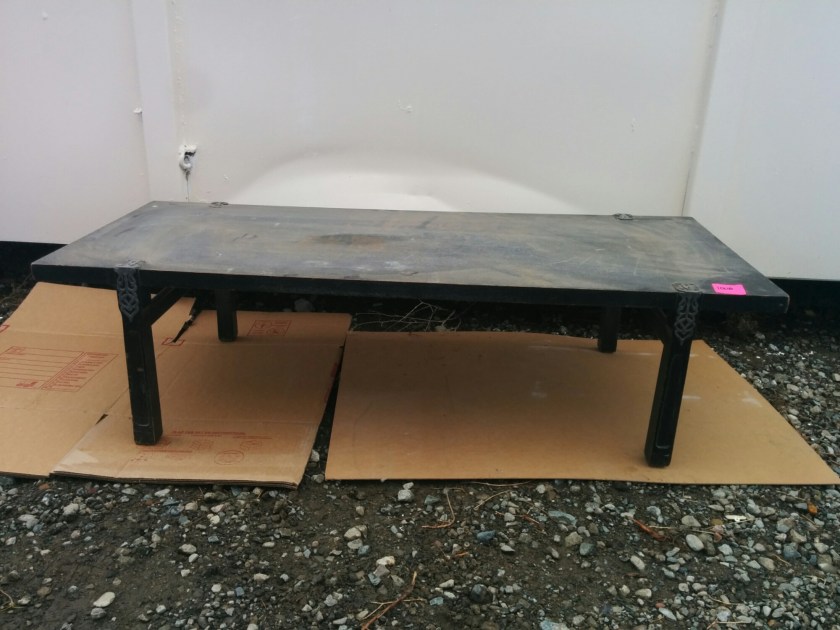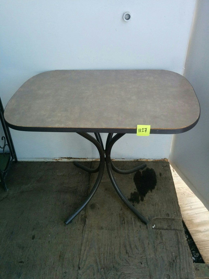 *SOLD* 1127 Formica Top Table Dumped, SOLD Edge is raising a bit. Metal legs. Needs a tablecloth! Lightweight. 29″H x 35″W x 23.5″D