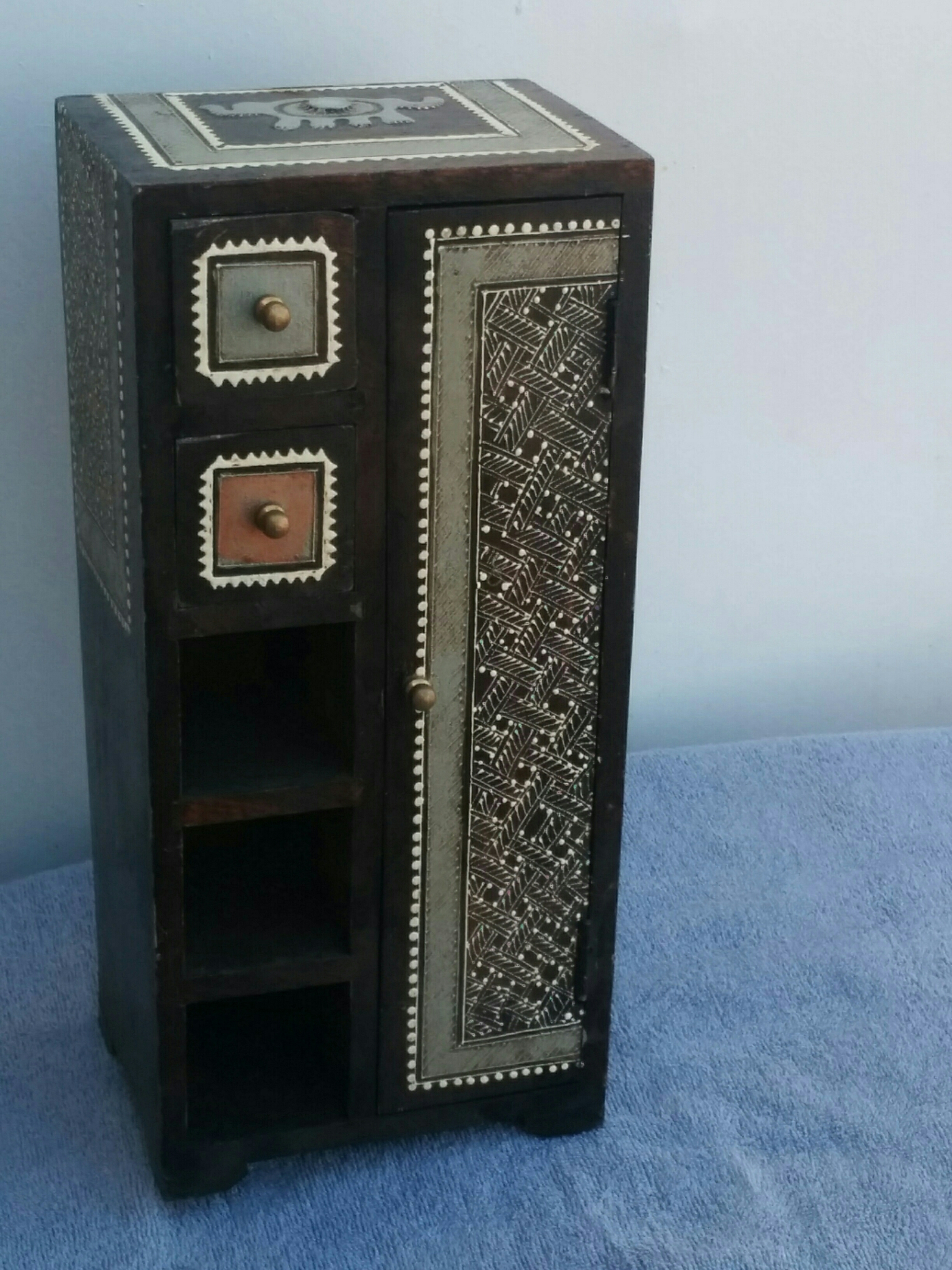 *SOLD* 1113 Tiny Drawers Dumped, SOLD Very sad, missing drawers & a leg. Leg can be fixed, don’t know about the drawers. 15″H x 7″W x 5″D