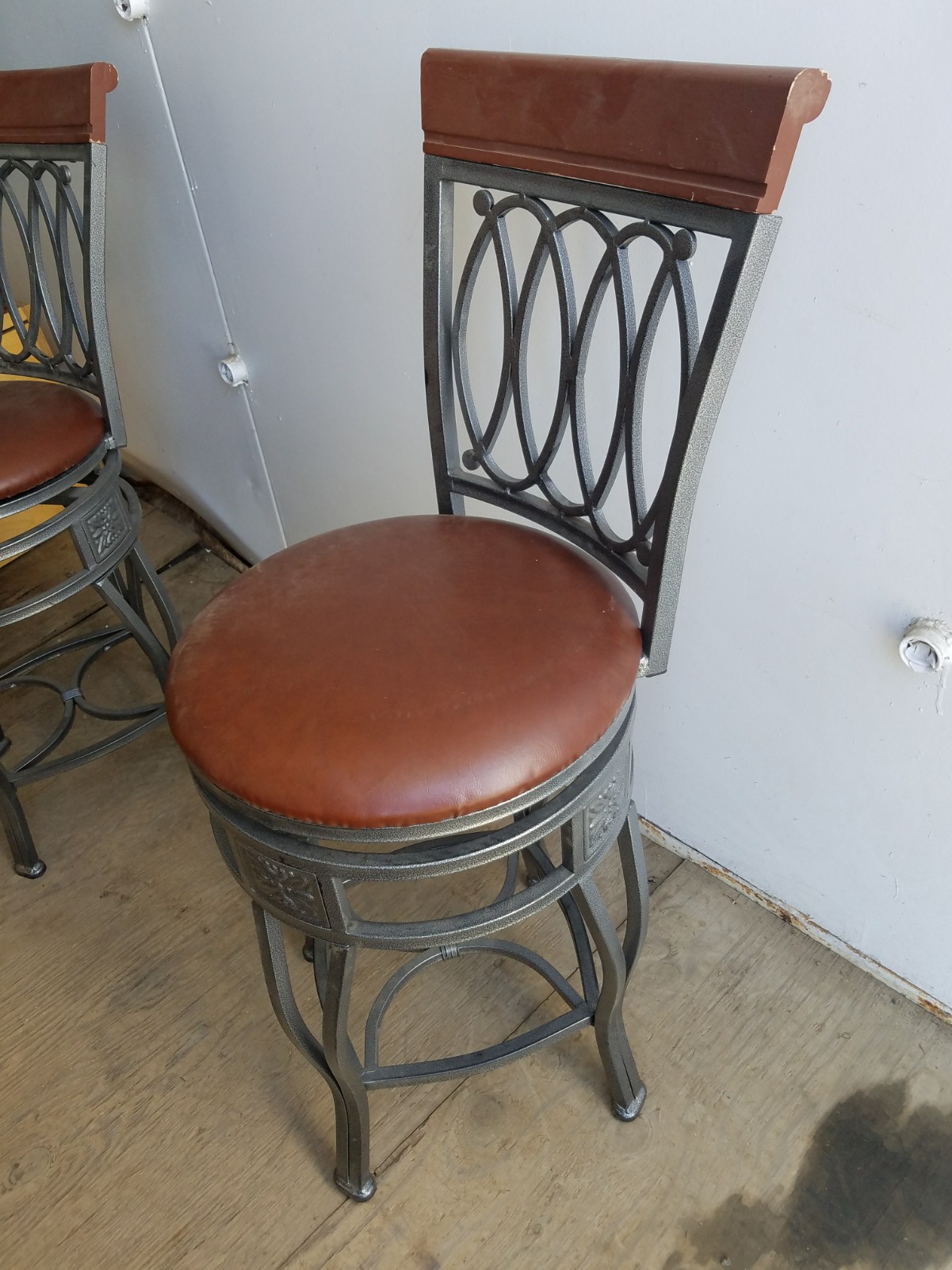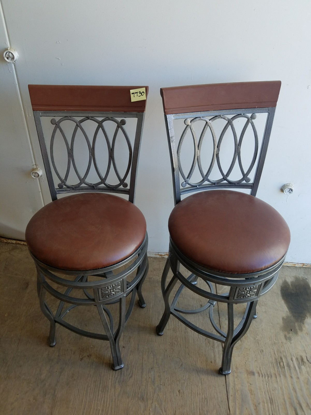 *SOLD* 7730 Four Metal Swivel Counter Stools Dumped, Furniture, SOLD Seat cushions screw on. Currently brown leather type material. Easy to change. No visible damage. Seat is 24″H + 16″ for the back. Seat is 16″D.