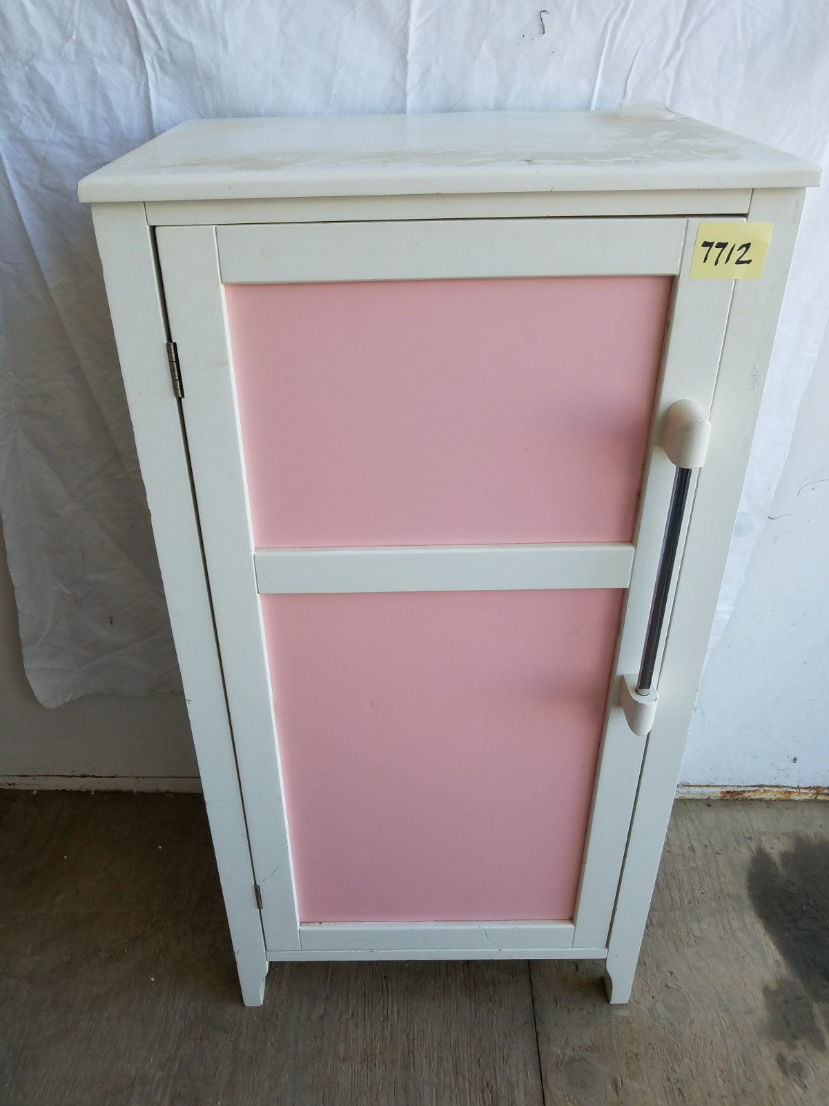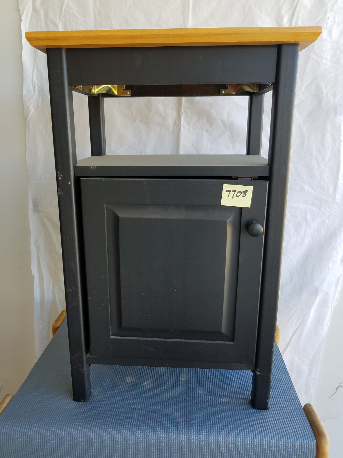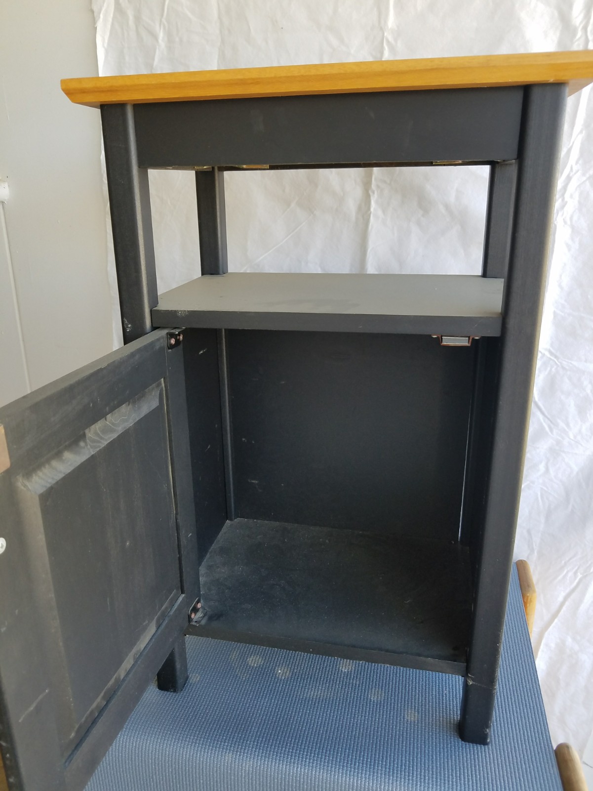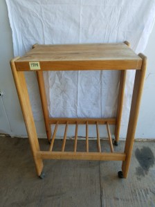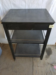 It looks like it could be a rolling liquor bar because it has a metal bar on the shelves so stuff does not fall out. The bottom shelf is fairly tall and could fit bottles in it. It has a drawer for accoutrements! Just a thought. It is missing a wheel. You could take the other three off or buy 4 to keep it rolling!