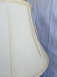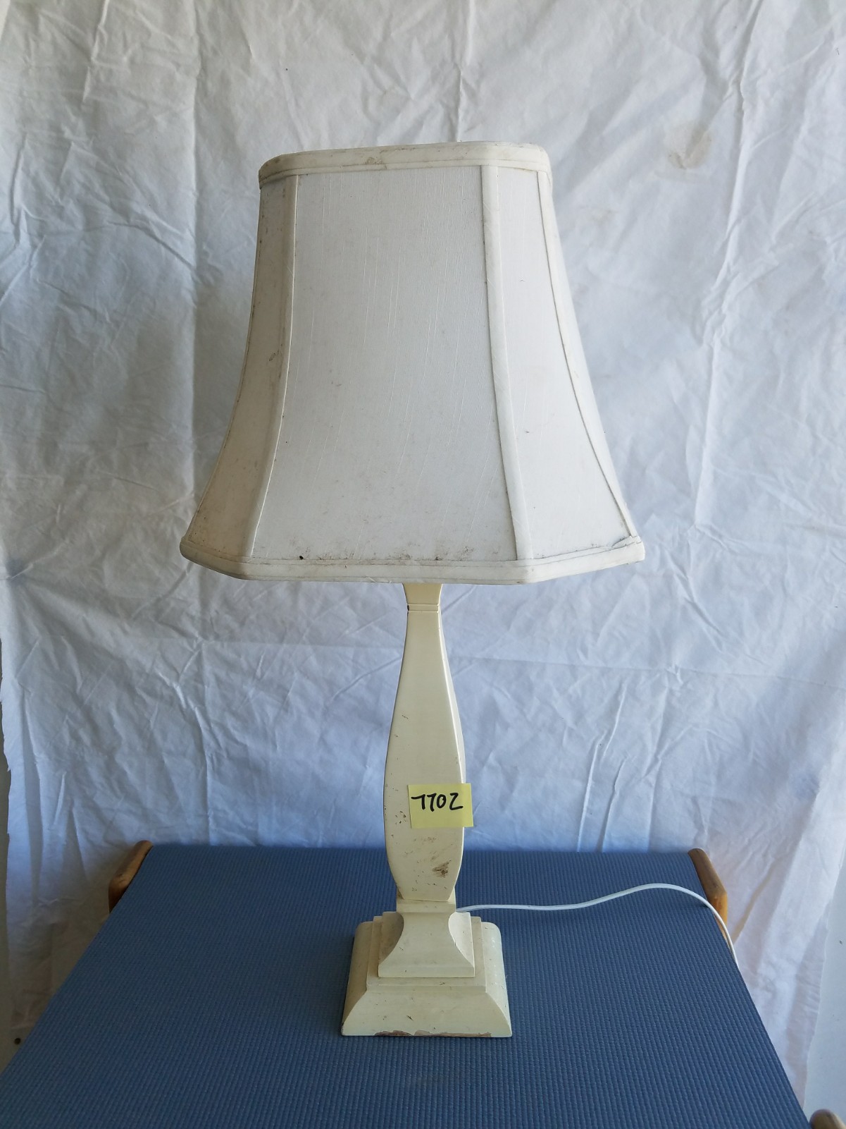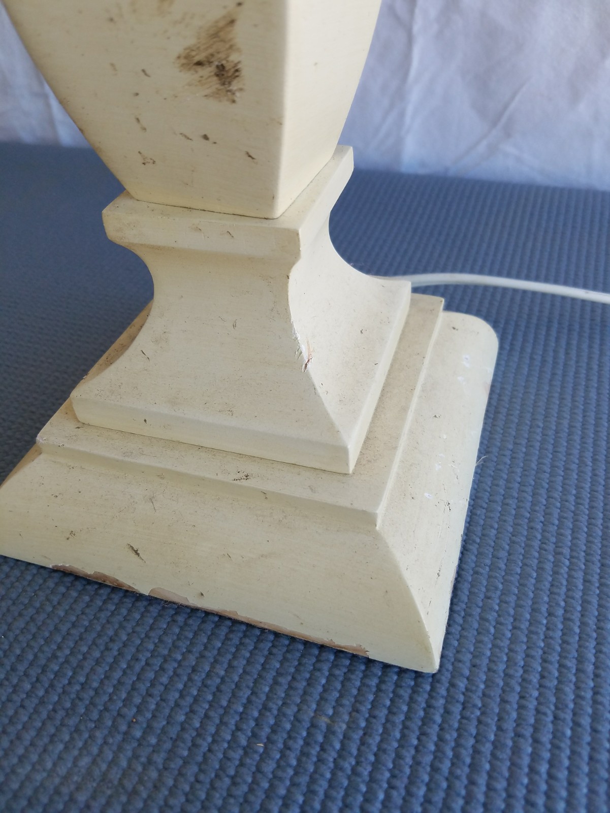 *SOLD* 7702 Cream Colored Lamp SOLD Obviously dirty lamp & shade. It has enamel paint on wood. Some scratches and nicks. 26″H – the base is 5.5″x5.5