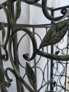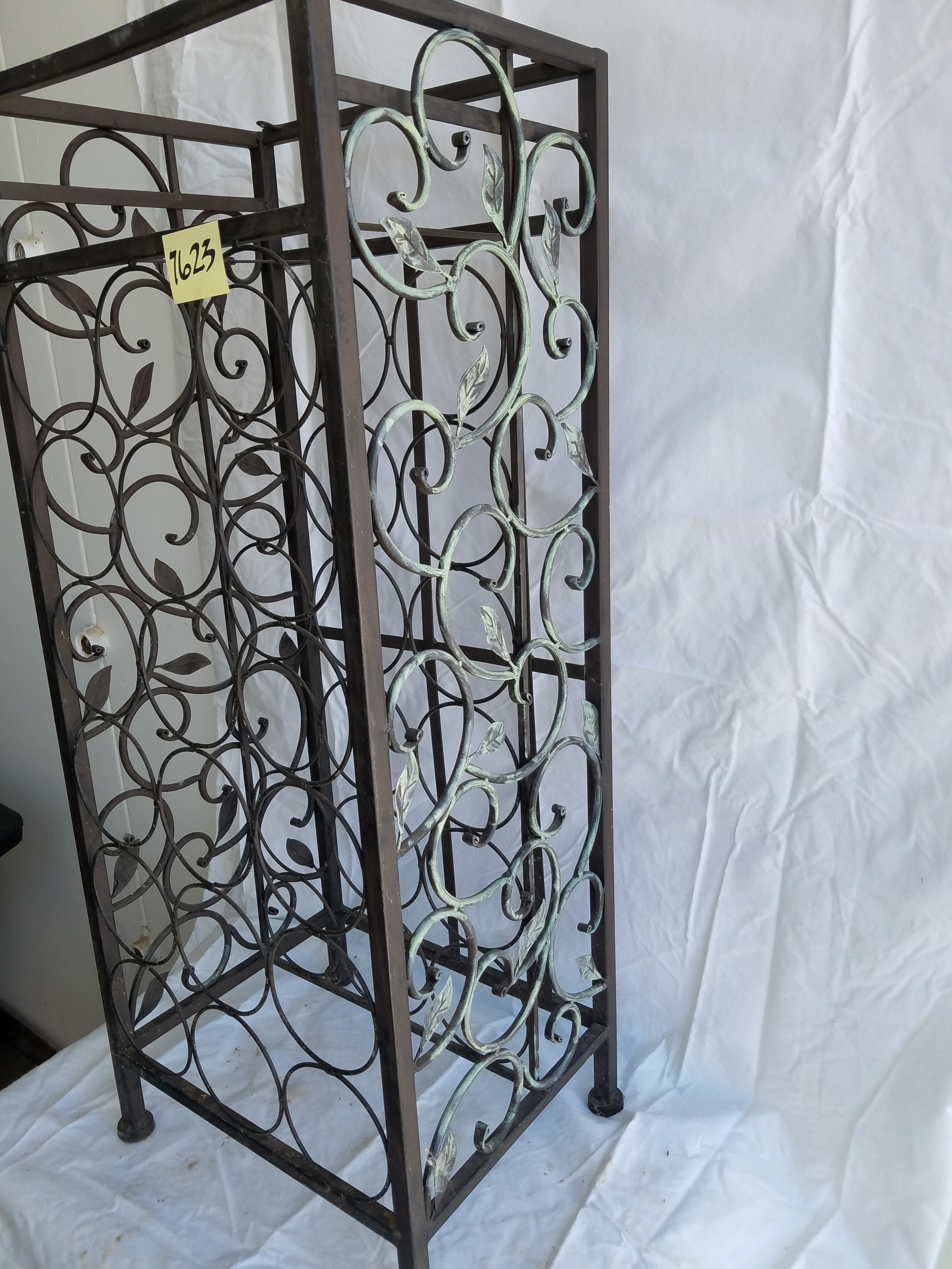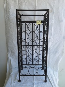 *SOLD* 7623 Grape Motif Wine Rack SOLD 34″H x 14″W x 11″D. Top has small metal tabs with a hole, maybe to screw in a top, could be made into a table. Can have a wood board cut to size for small charge.