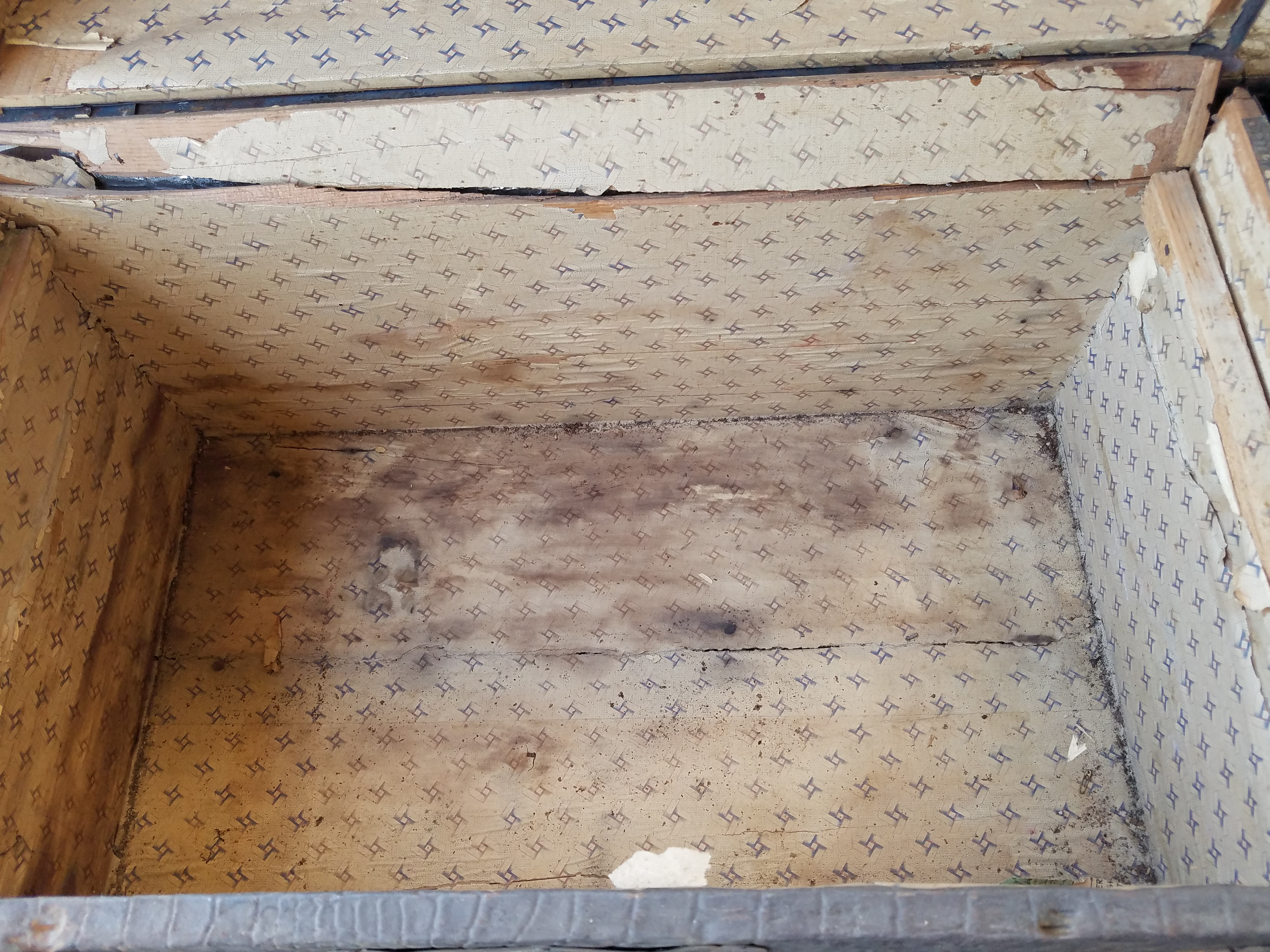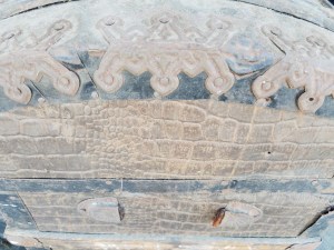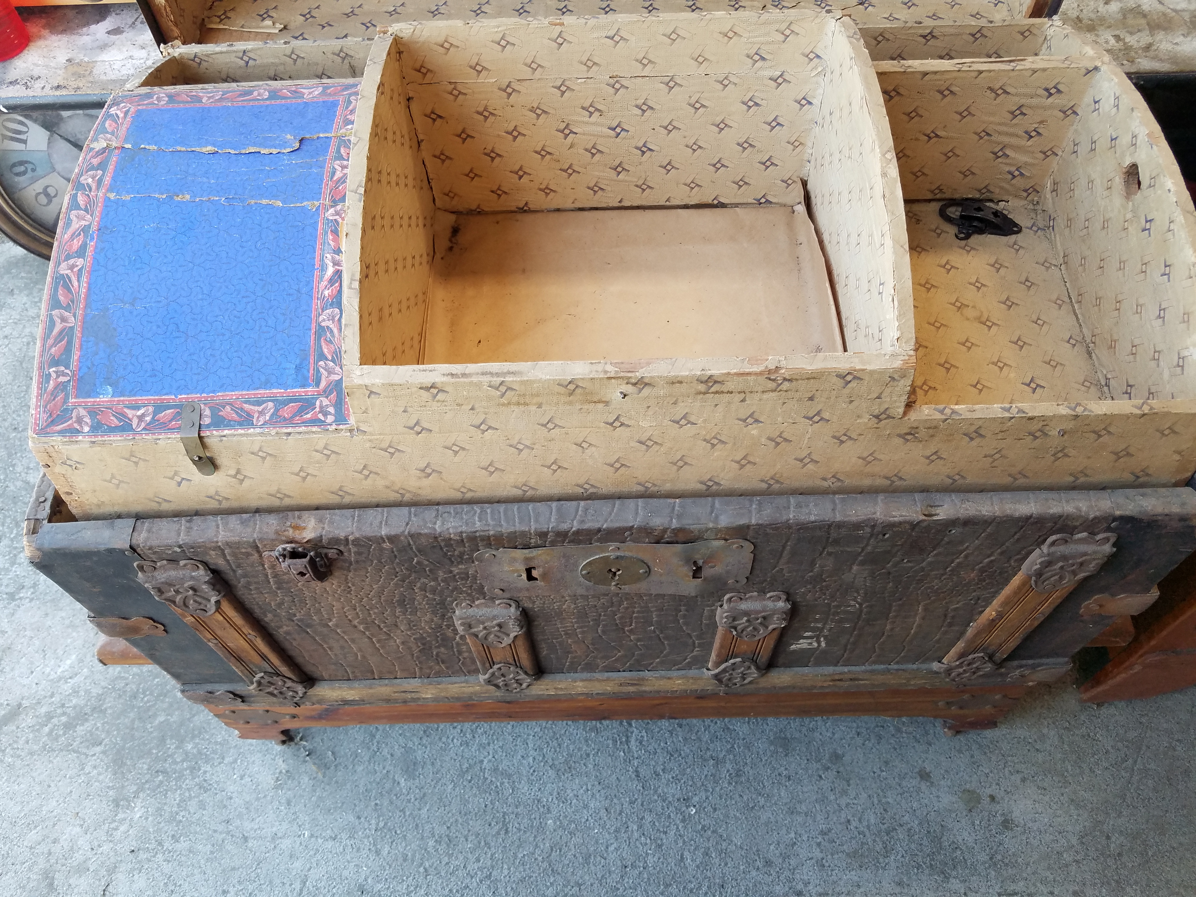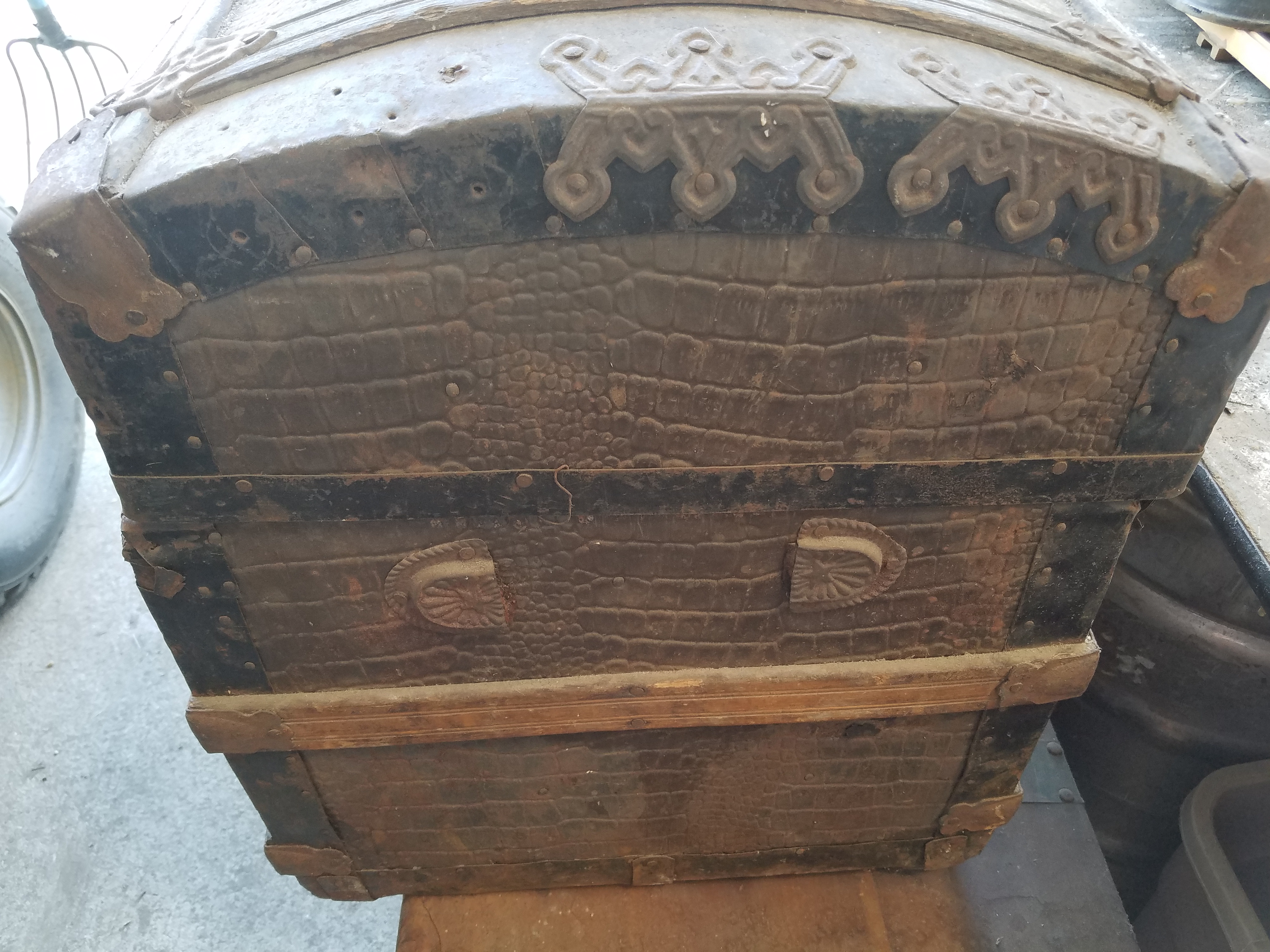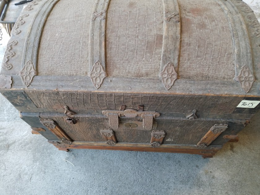 *SOLD* 7615B Very Old Used & Abused BUT Gorgeous Traveling Trunk SOLD 20.5″H x 30″W x 17″D – Details on this are beautiful. Shame that it is not in good shape.