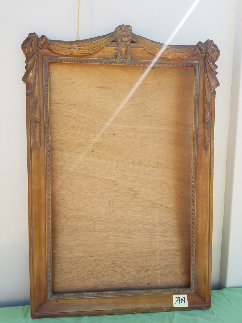 *SOLD* 7420 Old Possibly Antique Mirror Frame SOLD Two breaks which have been glued. 26.5″W x 26.5″H – Frame is 1.5″ W. No glass or mirror.