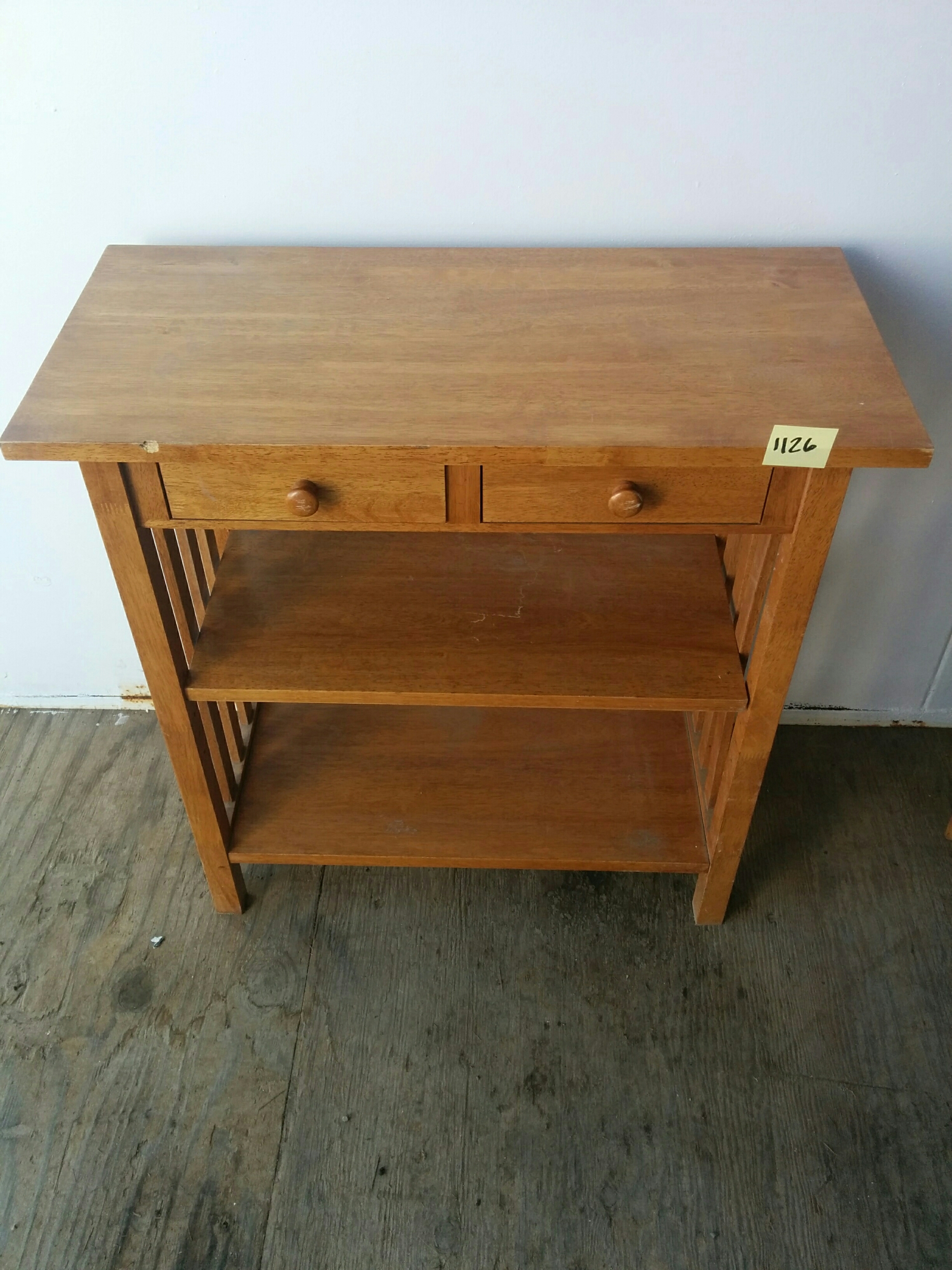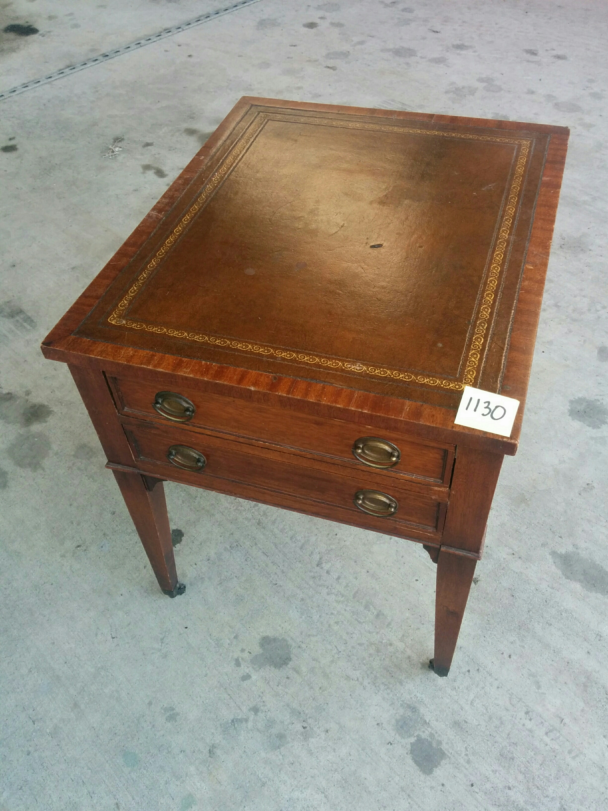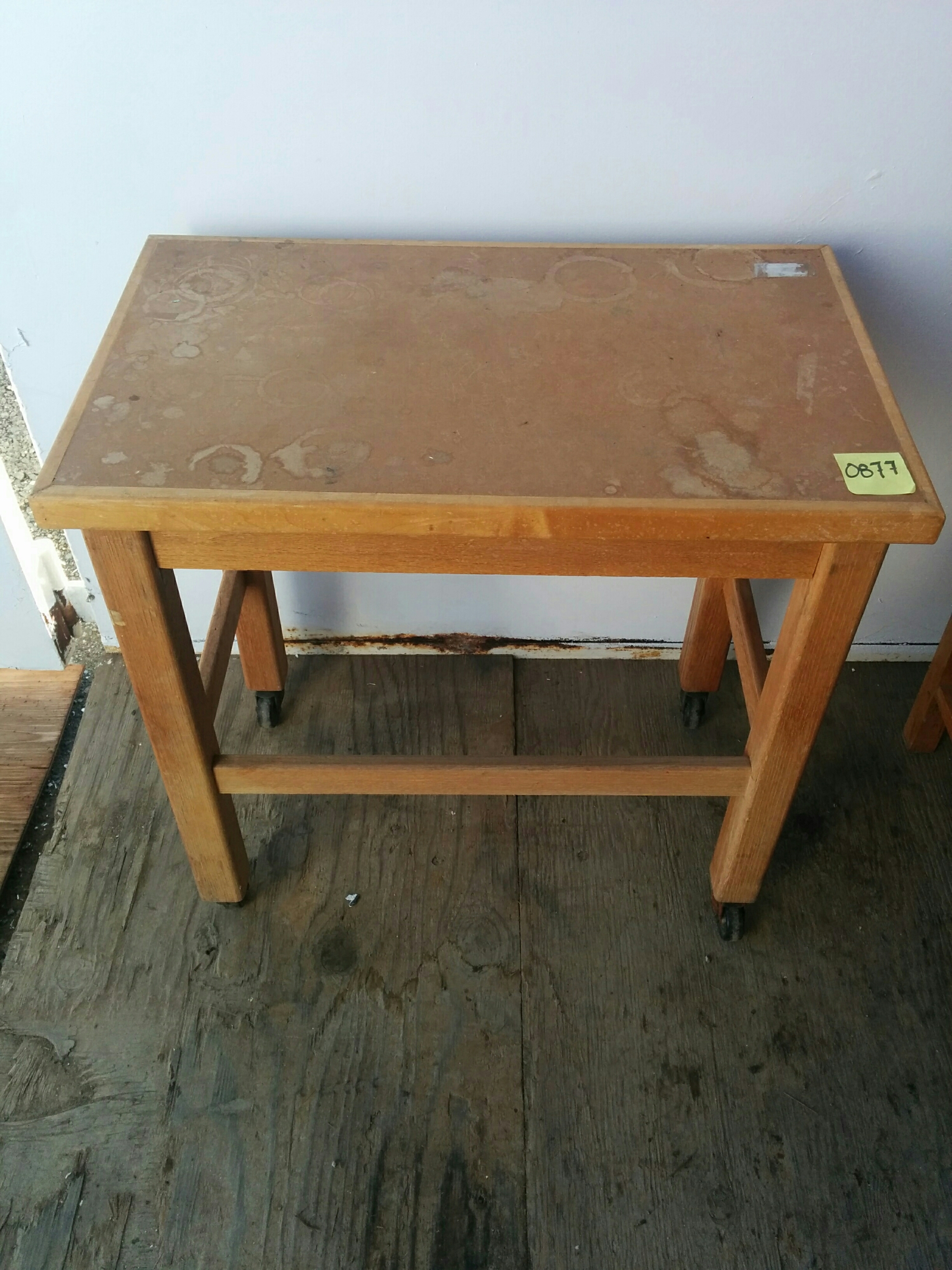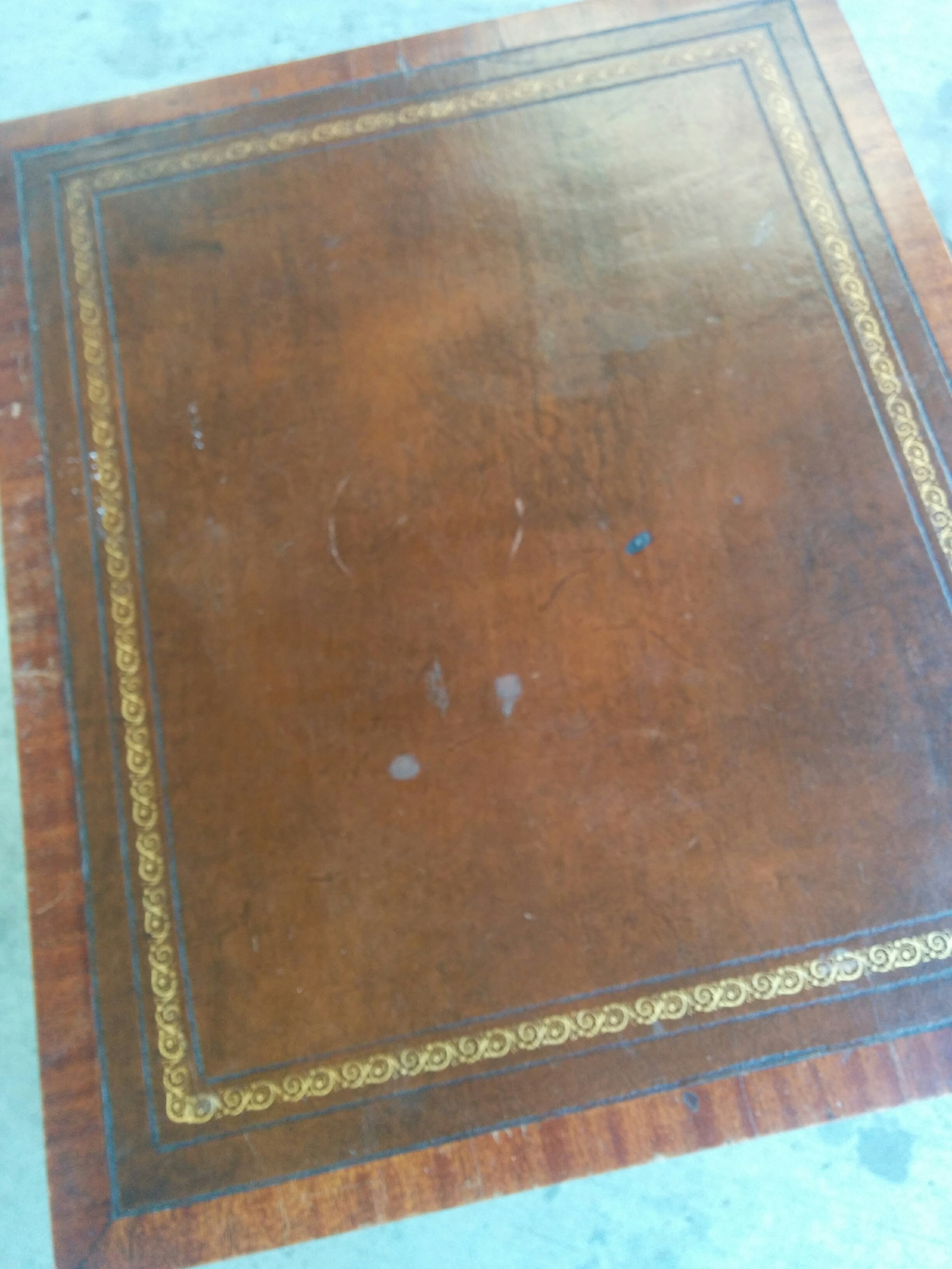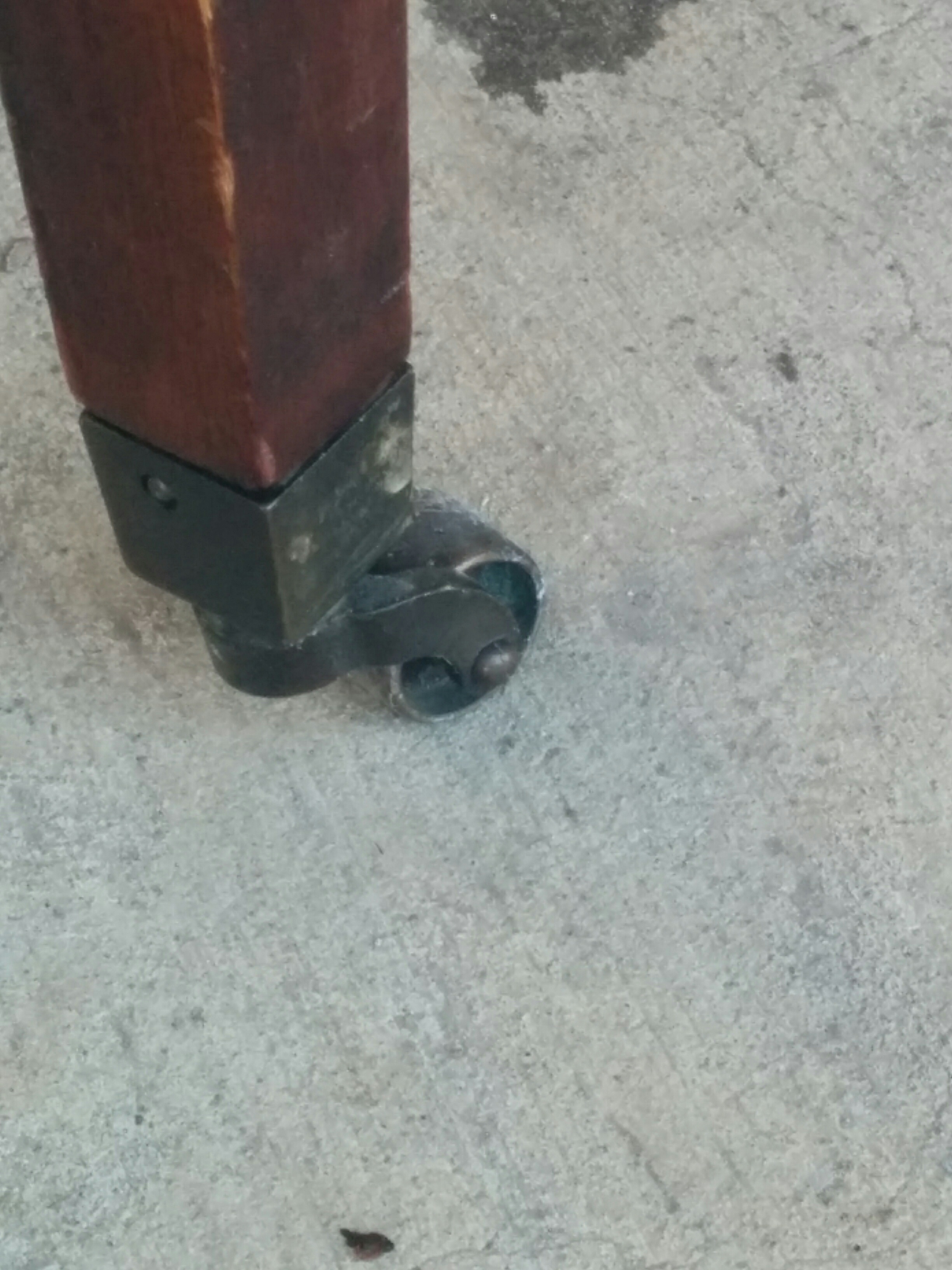 I think it might be “older” because of the metal wheels. The top seems to be leather with a gold trim. Unfortunately it has some small damage, seems to have a cigarette burn in the middle. Need a creative way to cover it up. The wood is in decent shape. 24″H x 20″W x 24″D