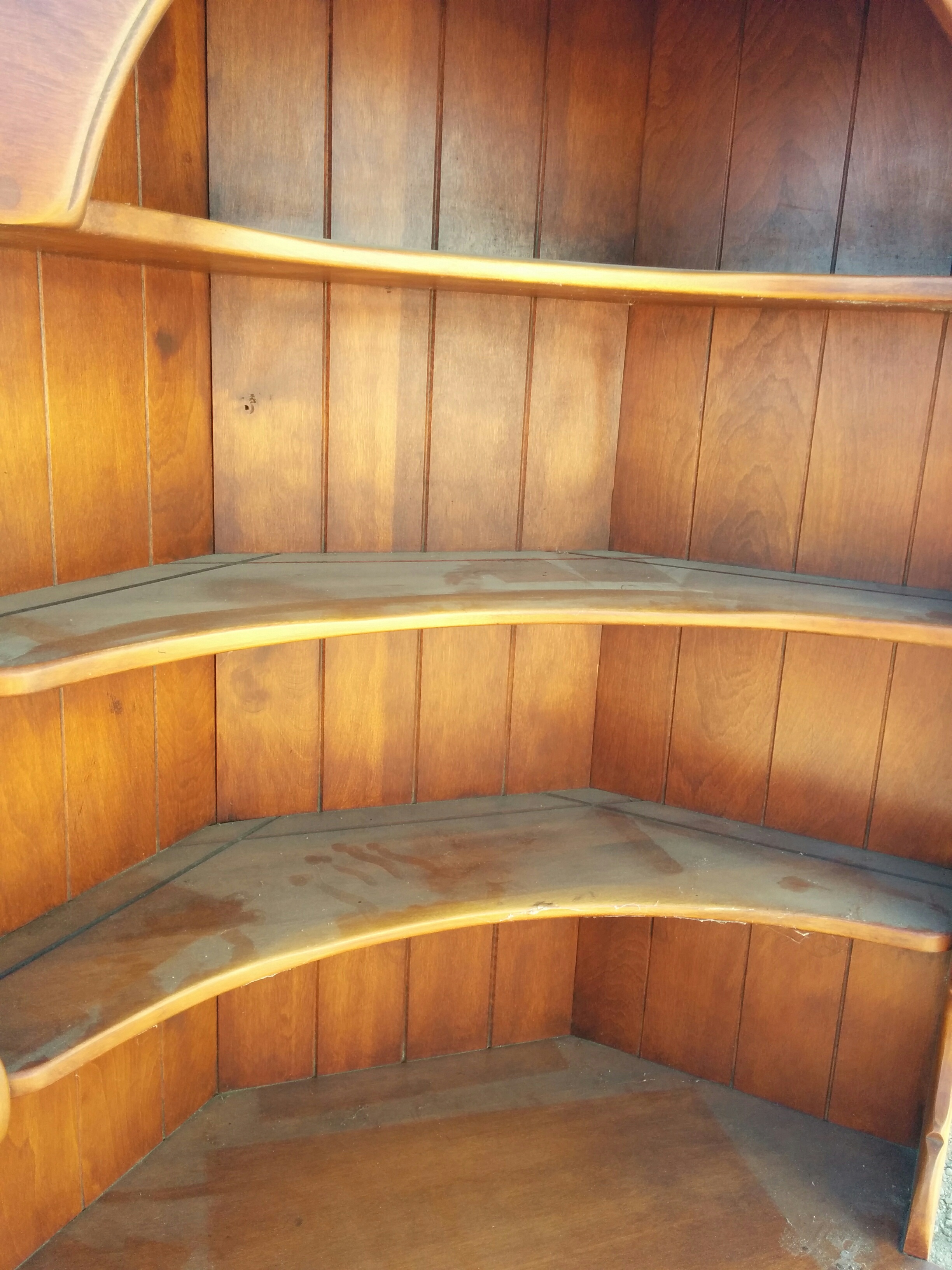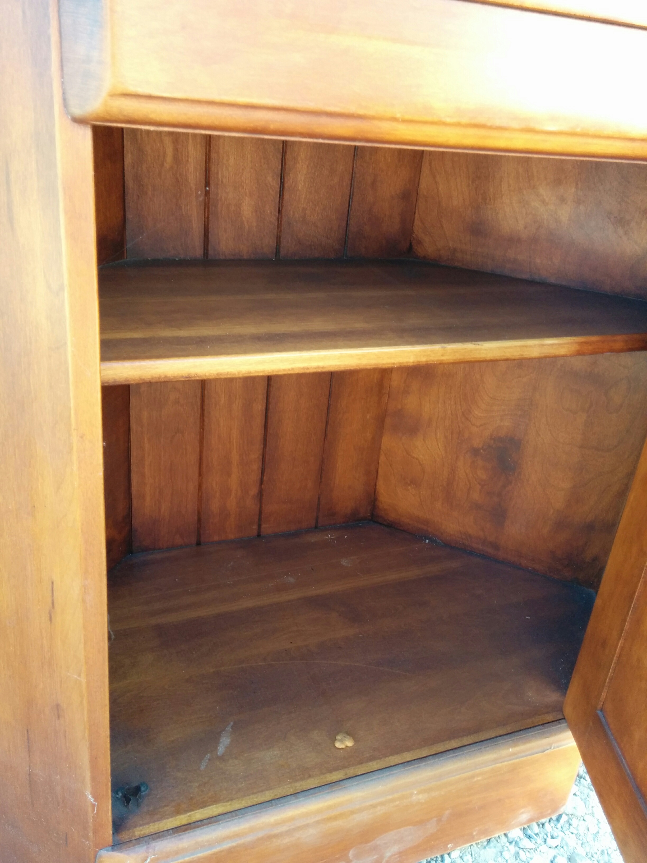 Very good condition except for bottom side piece seems to be broken off (refer to picture). You can’t see it because it would be against the wall and does not seem to affect the stability of the unit. 68″H x 32″W x 16.5″D. There is the exact same piece posted on ebay for $495.00 (#40678 Cushman Solid Maple Corner Unit), no bids at that price.