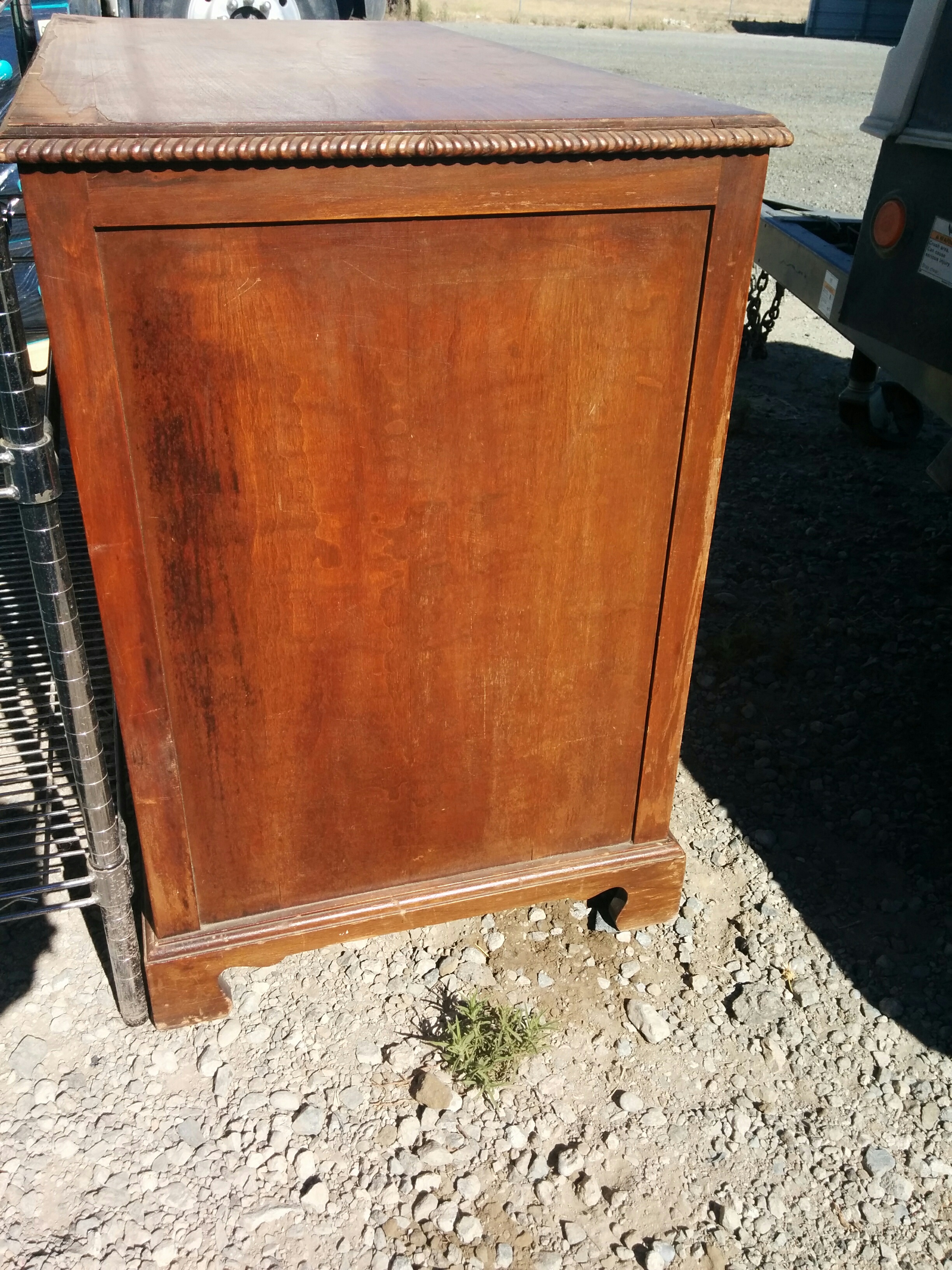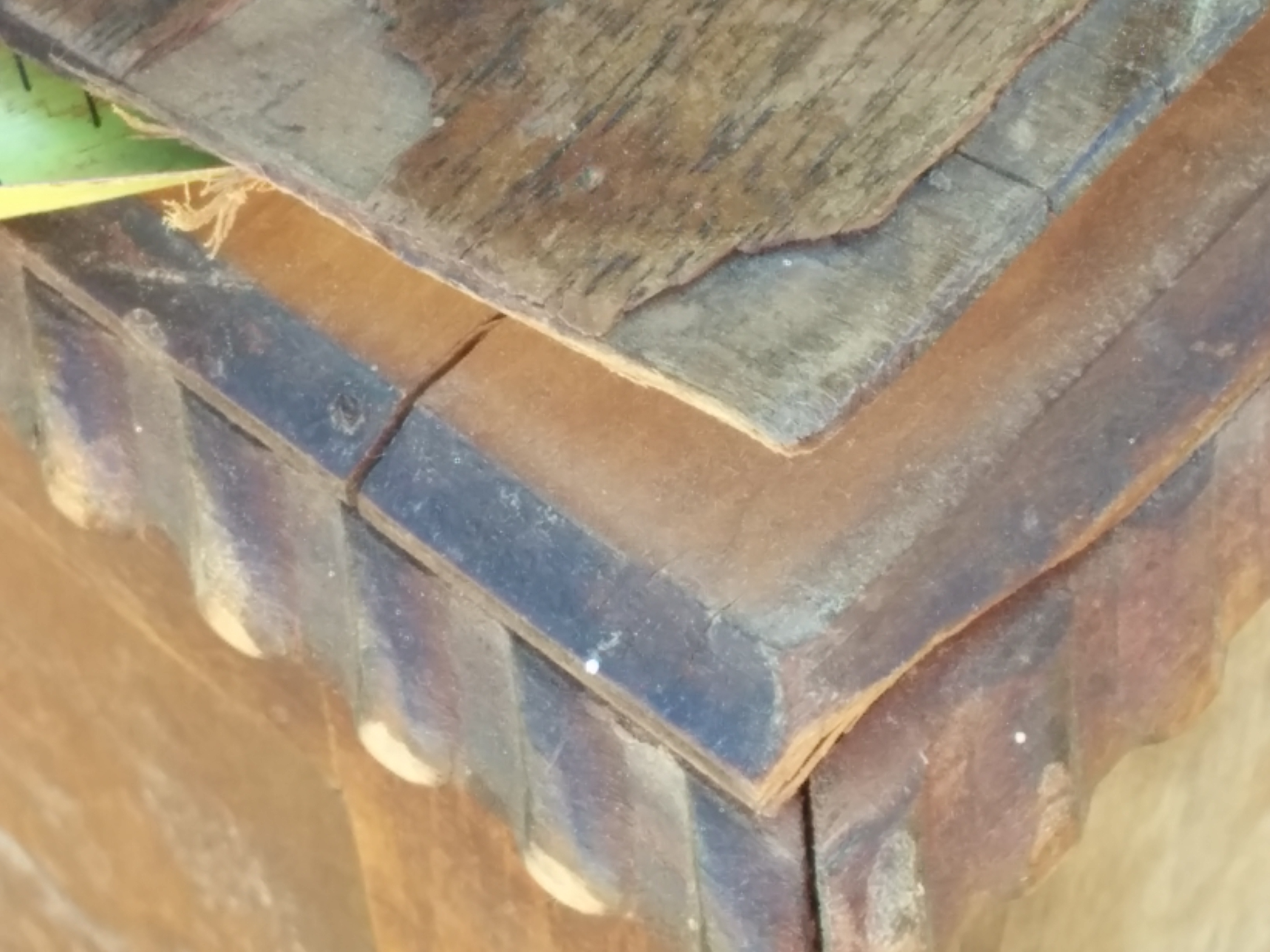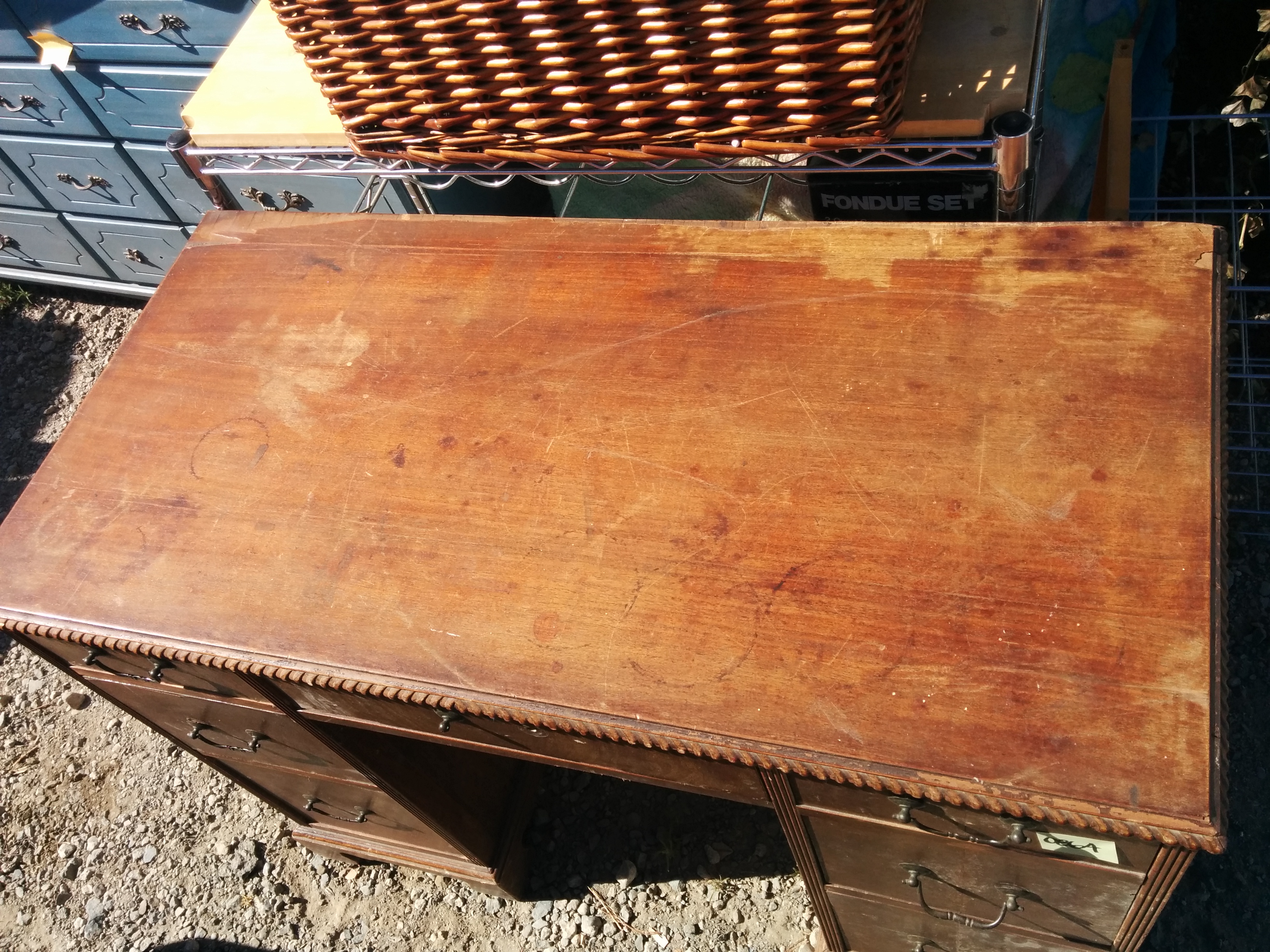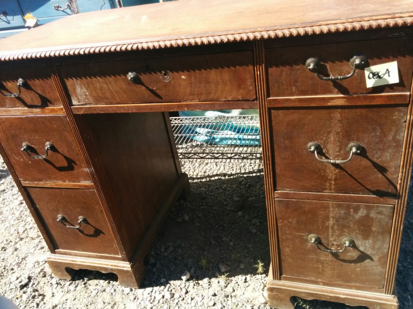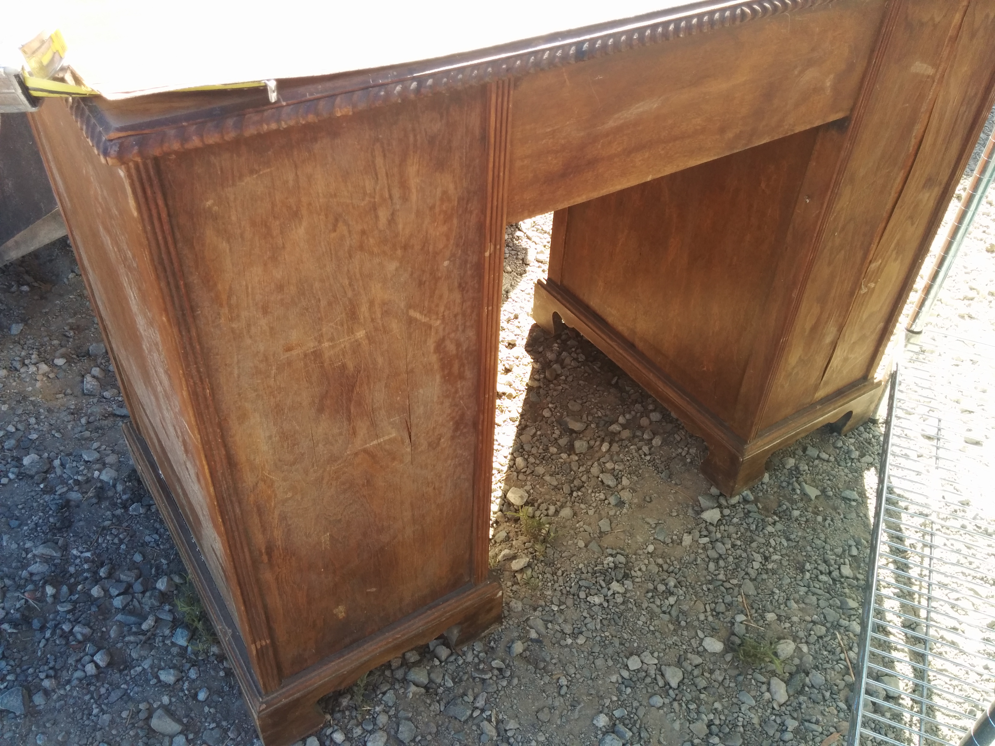 Needs work. There is some water damage on the back part of the top of the desk and behind it on the right side as well. See picture, I think the top can be peeled off to reveal the wood underneath. Has all drawer handles, found the missing one after I took the picture. Solid drawers. The two top ones on the right are actually one deep drawer.