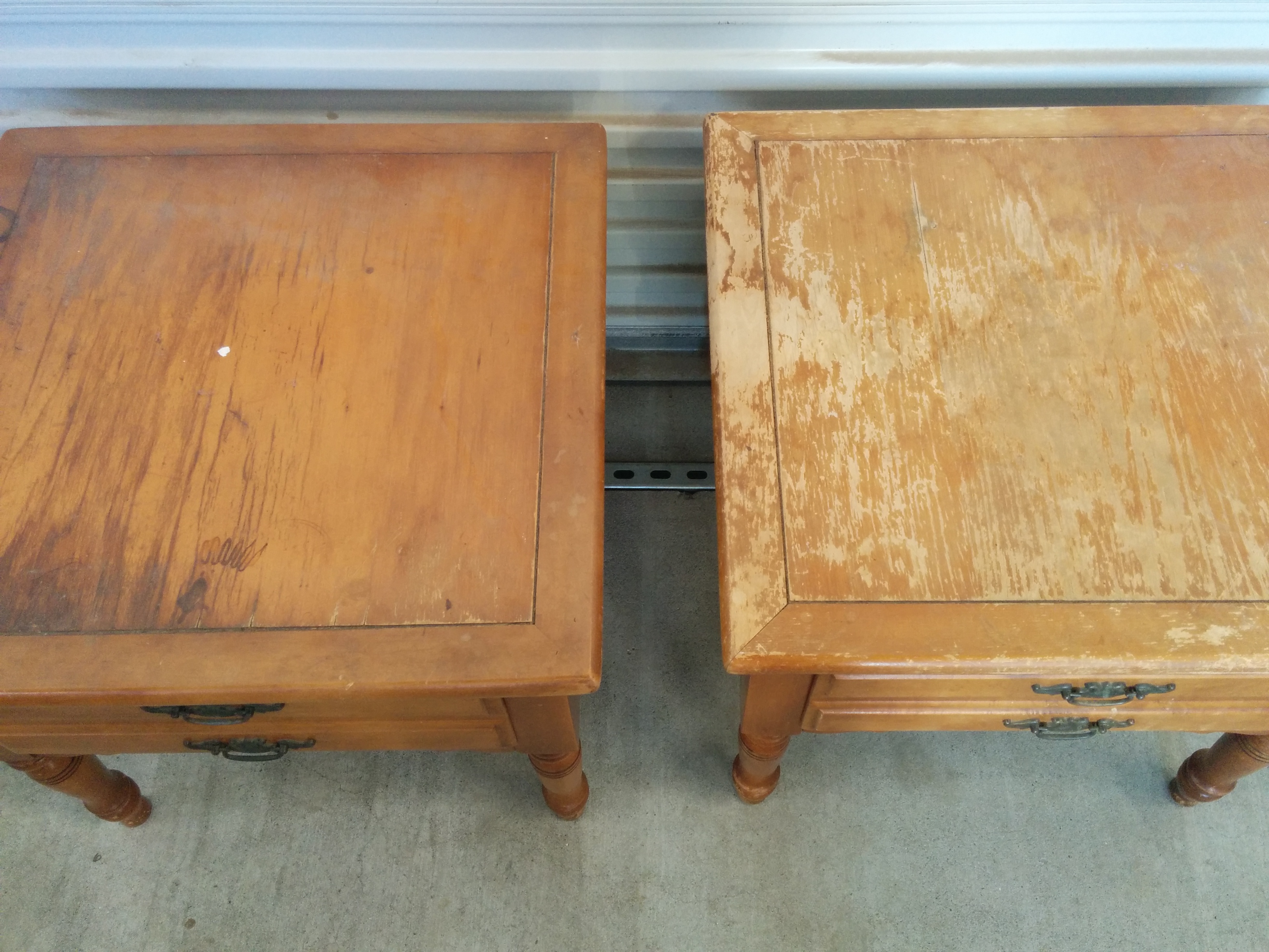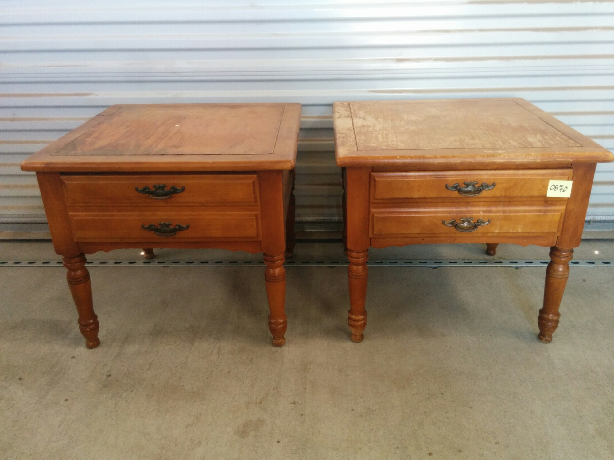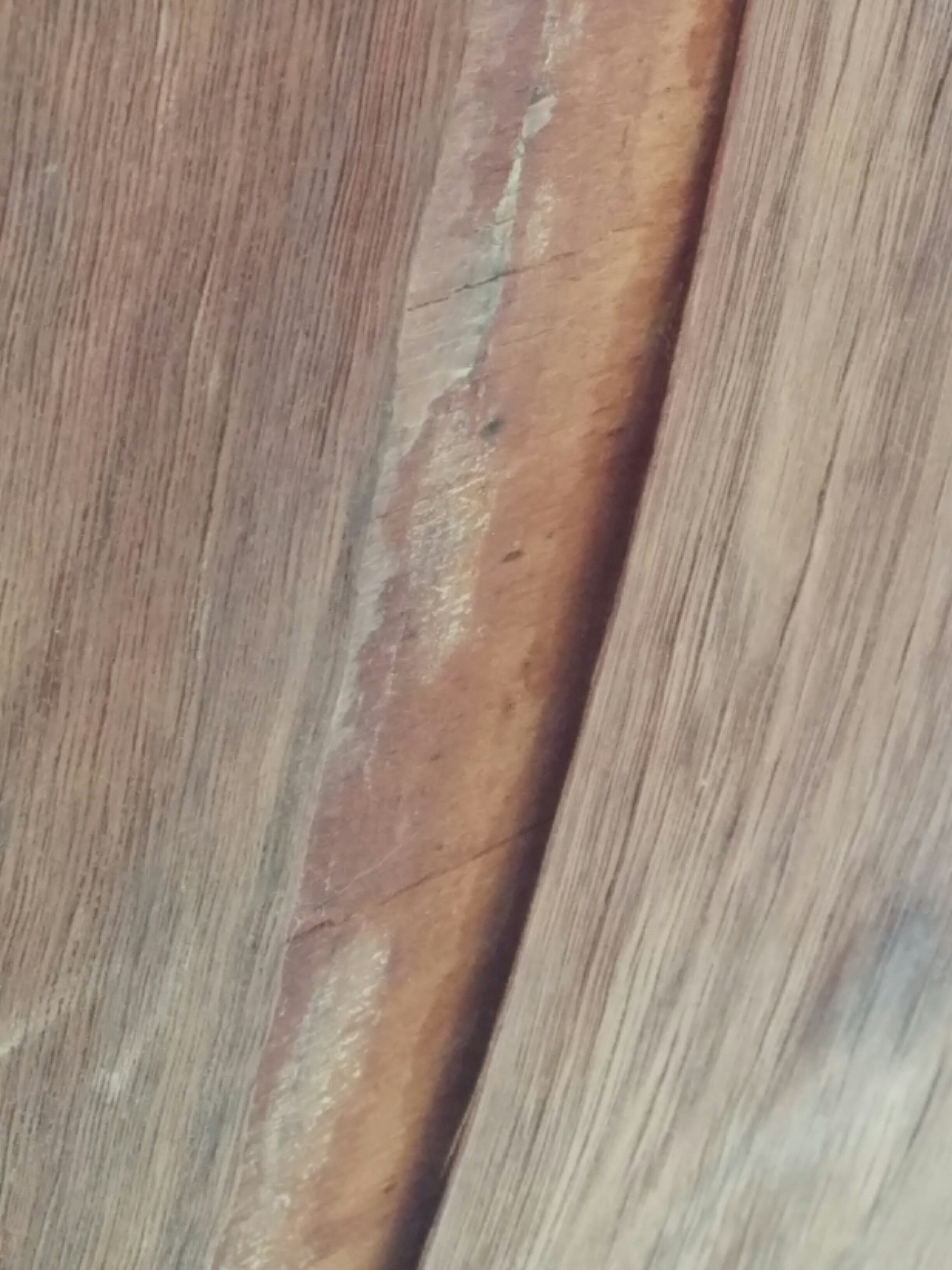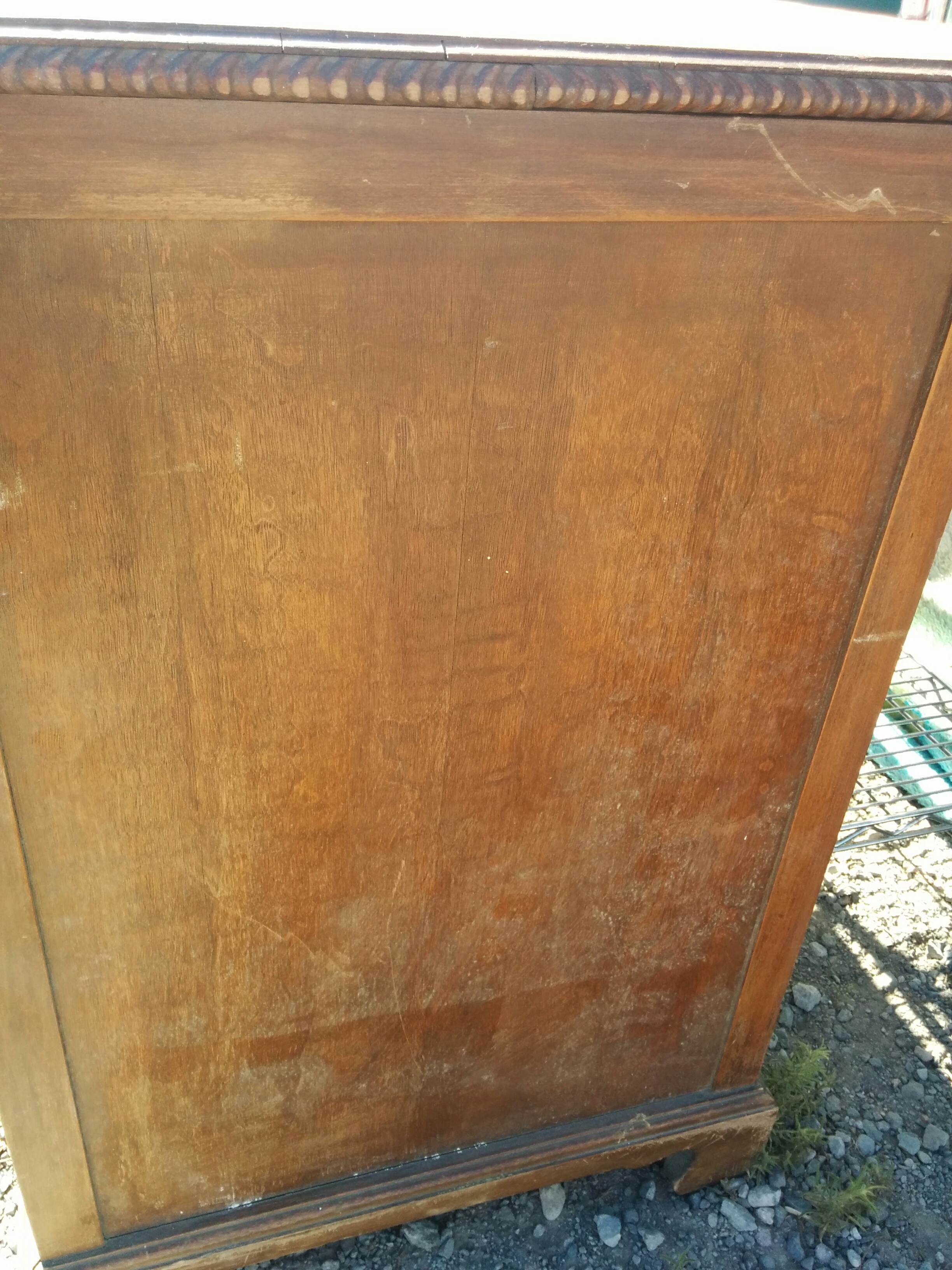 Needs work. There is some water damage on the back part of the top of the desk and behind it on the right side as well. See picture, I think the top can be peeled off to reveal the wood underneath. Has all drawer handles, found the missing one after I took the picture. Solid drawers. The two top ones on the right are actually one deep drawer.