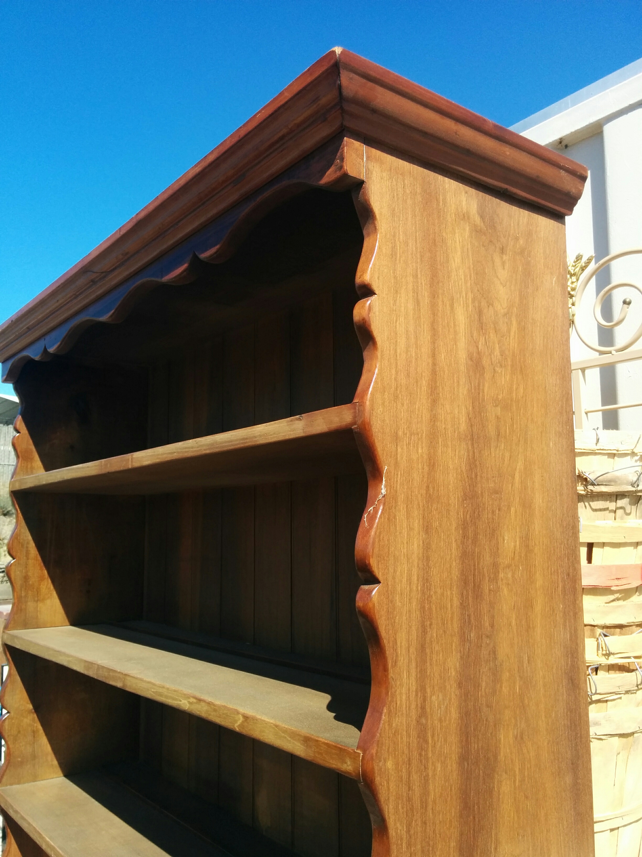 80″H x 43″W – Bottom section is 19″ D. Top shelves are 11″ D. The shelves have a ridge to display plates.