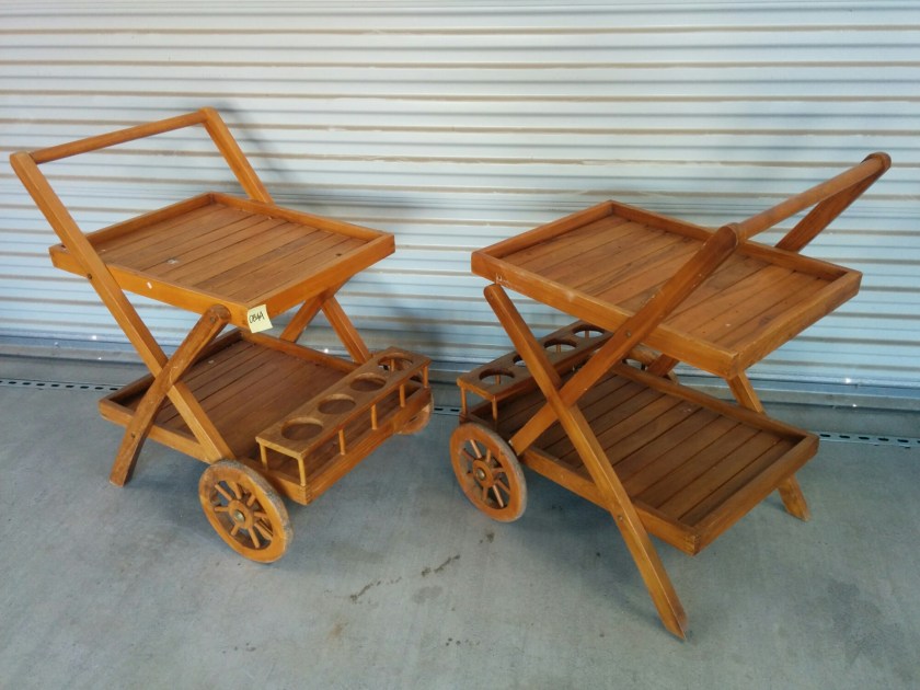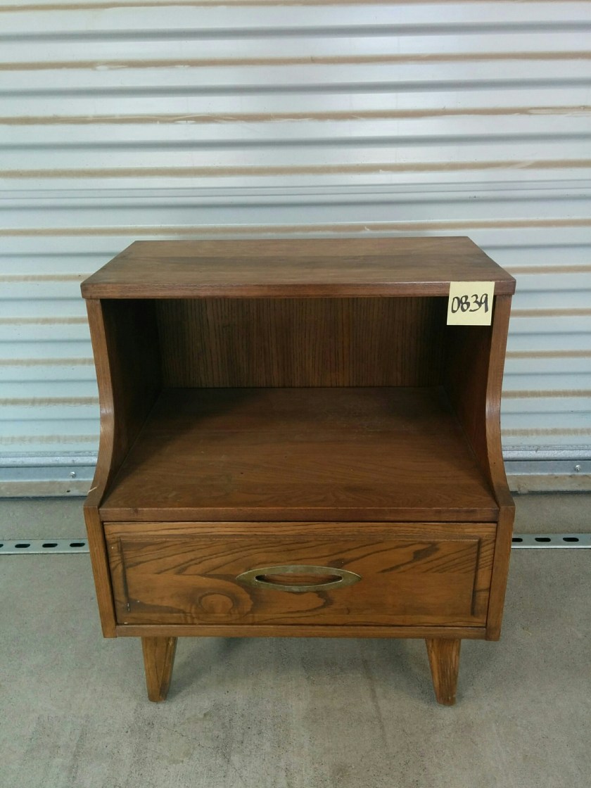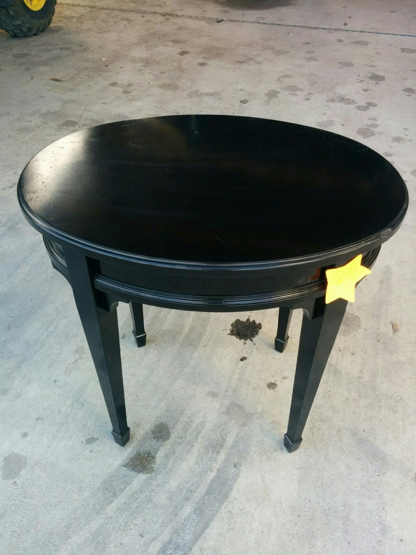 This table is particle board. You can see the small nick on the edge. The missing piece on the right side of the leg has been replaced. Nice little table for a corner somewhere. 21″H x 22″W x 17″D.
