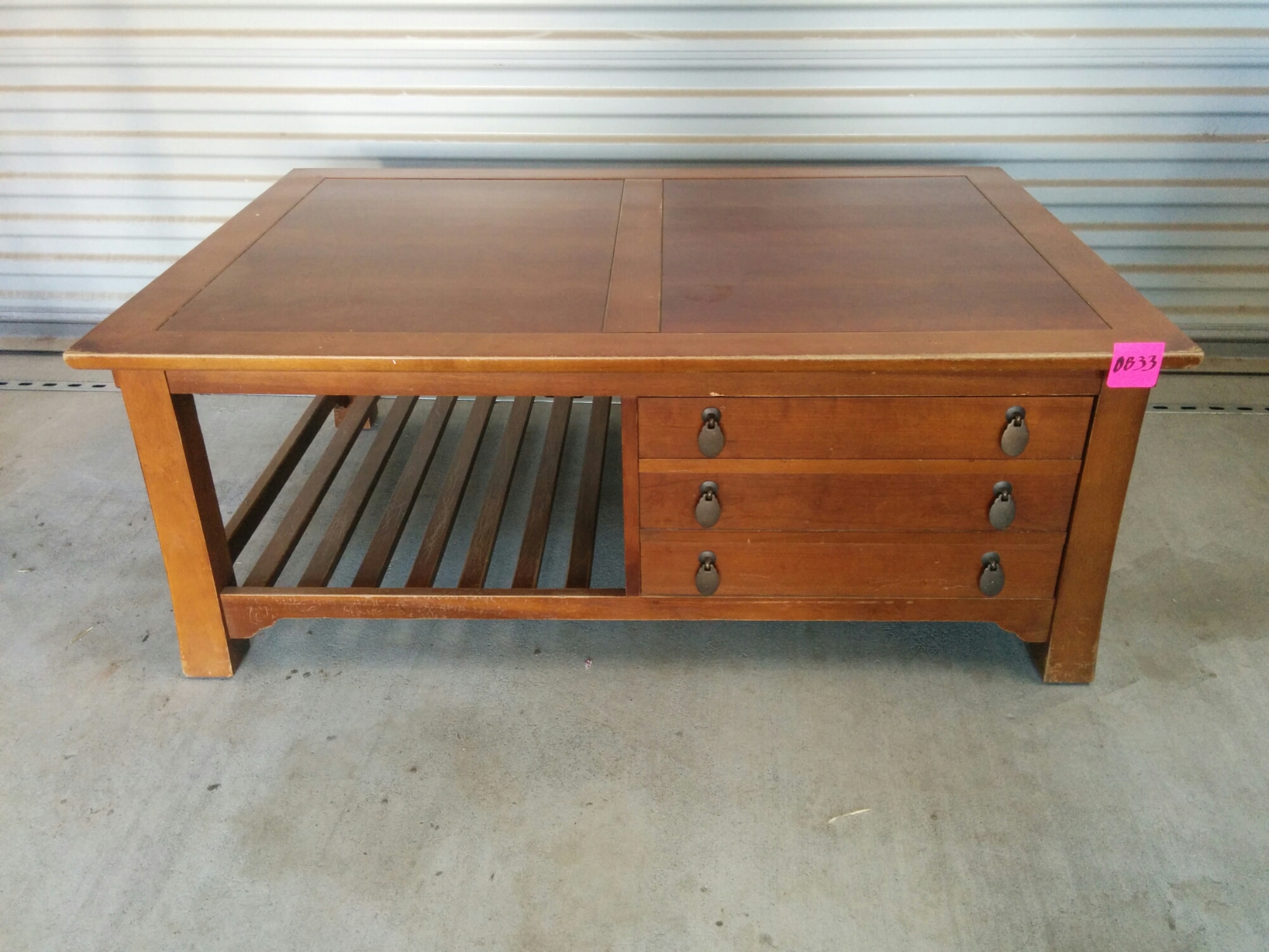 Looks like three drawers but it is really only one large one. Drawer opens from one side. The other side has a “fake” facade so it looks like the same drawer. Good Condition. 18″H x 48″W x 33″D