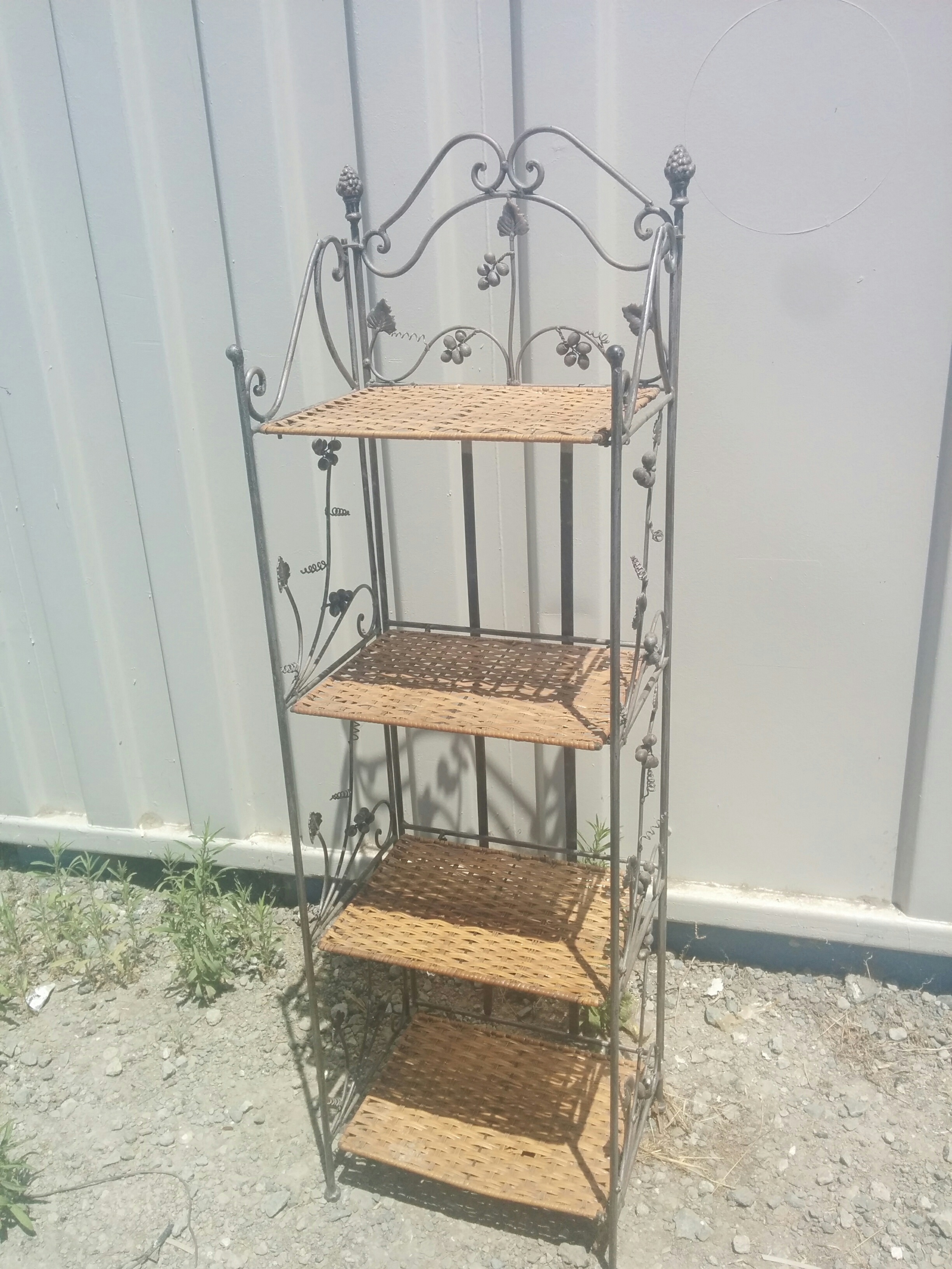 *SOLD* 0716 Metal Grape Shelves SOLD Shelves are rattan and the whole thing folds in. 56″H x 16″W x 12″D