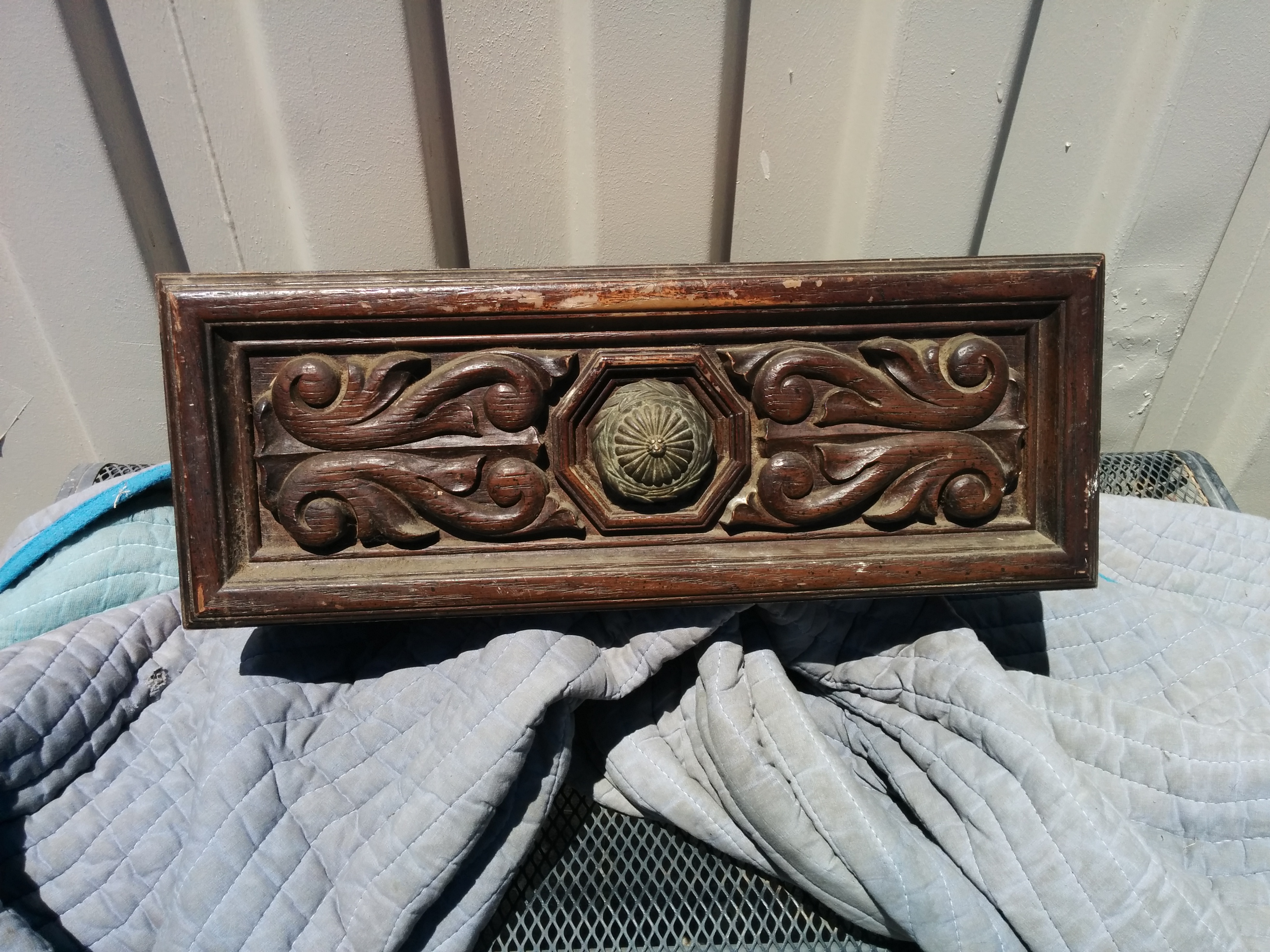 *SOLD* 0712B Small Carved Drawer w Really Cool Knob SOLD I am not sure what one could do with this drawer. It was the only thing that was saved from whatever piece of furniture it came from. The knob is intricate and very cool. The drawer is 8″ H x 20″W x 12″D.