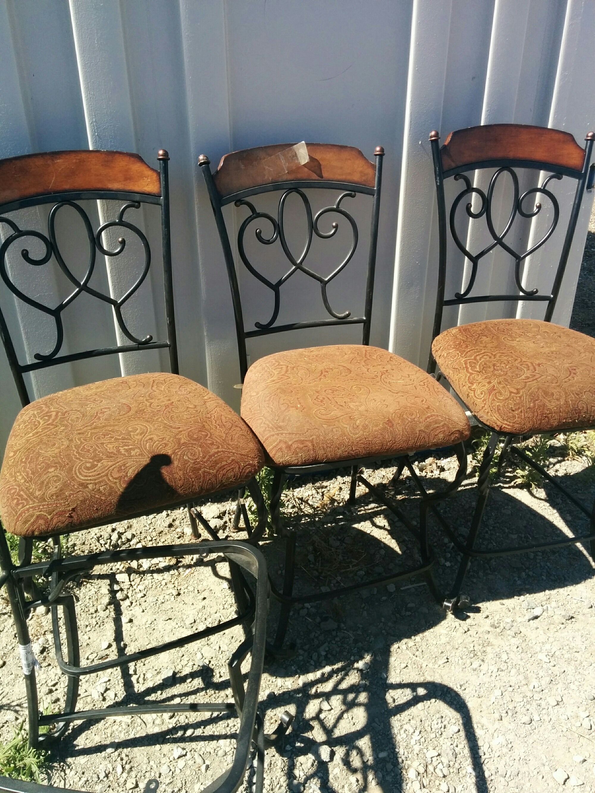 *SOLD* 0703 Iron Counter Chairs SOLD 4 chairs total hit one is missing the seat. 24″H to seat + 20″ for the back. Seat is 20″ wide X 18.5 deep
