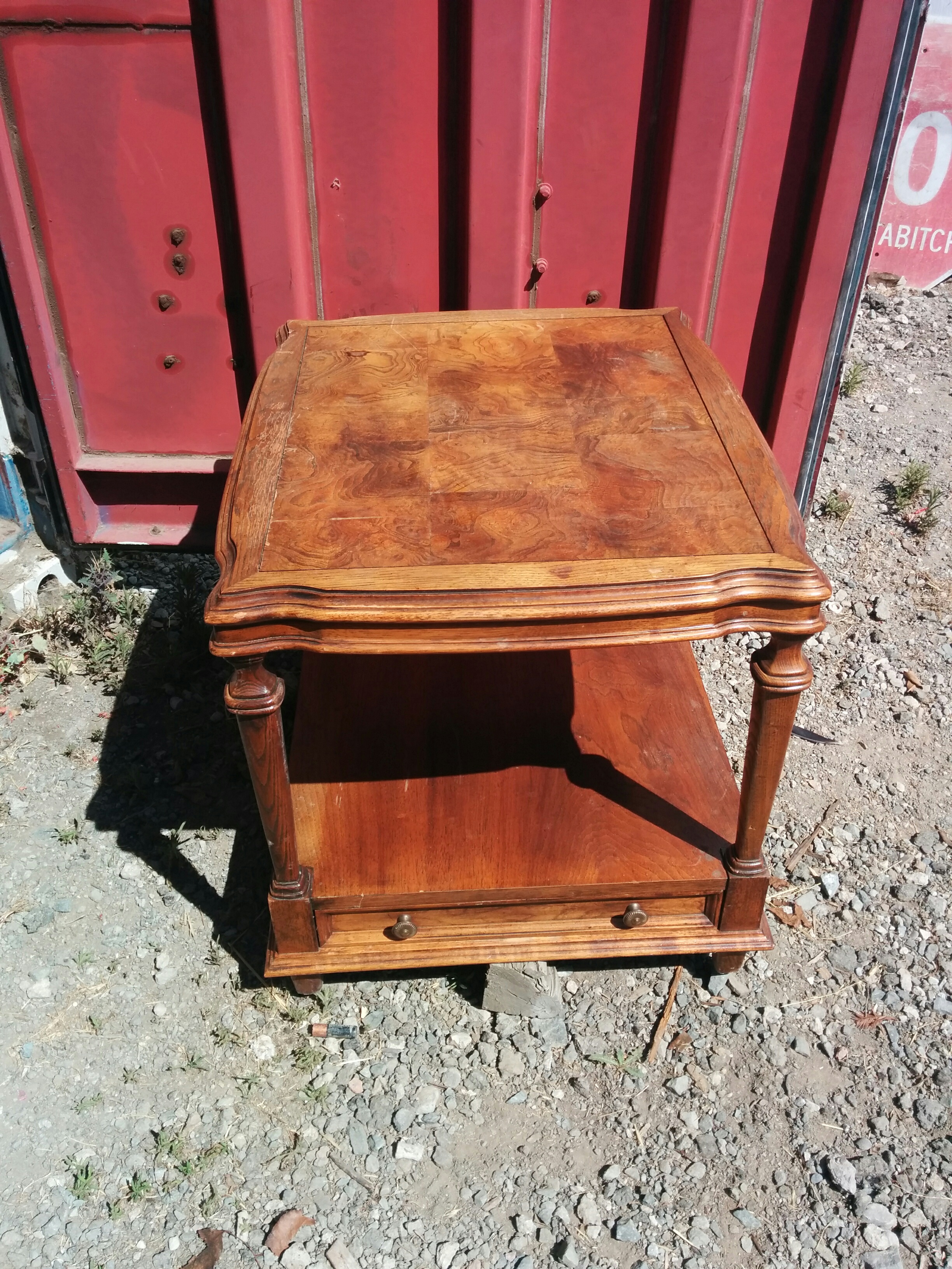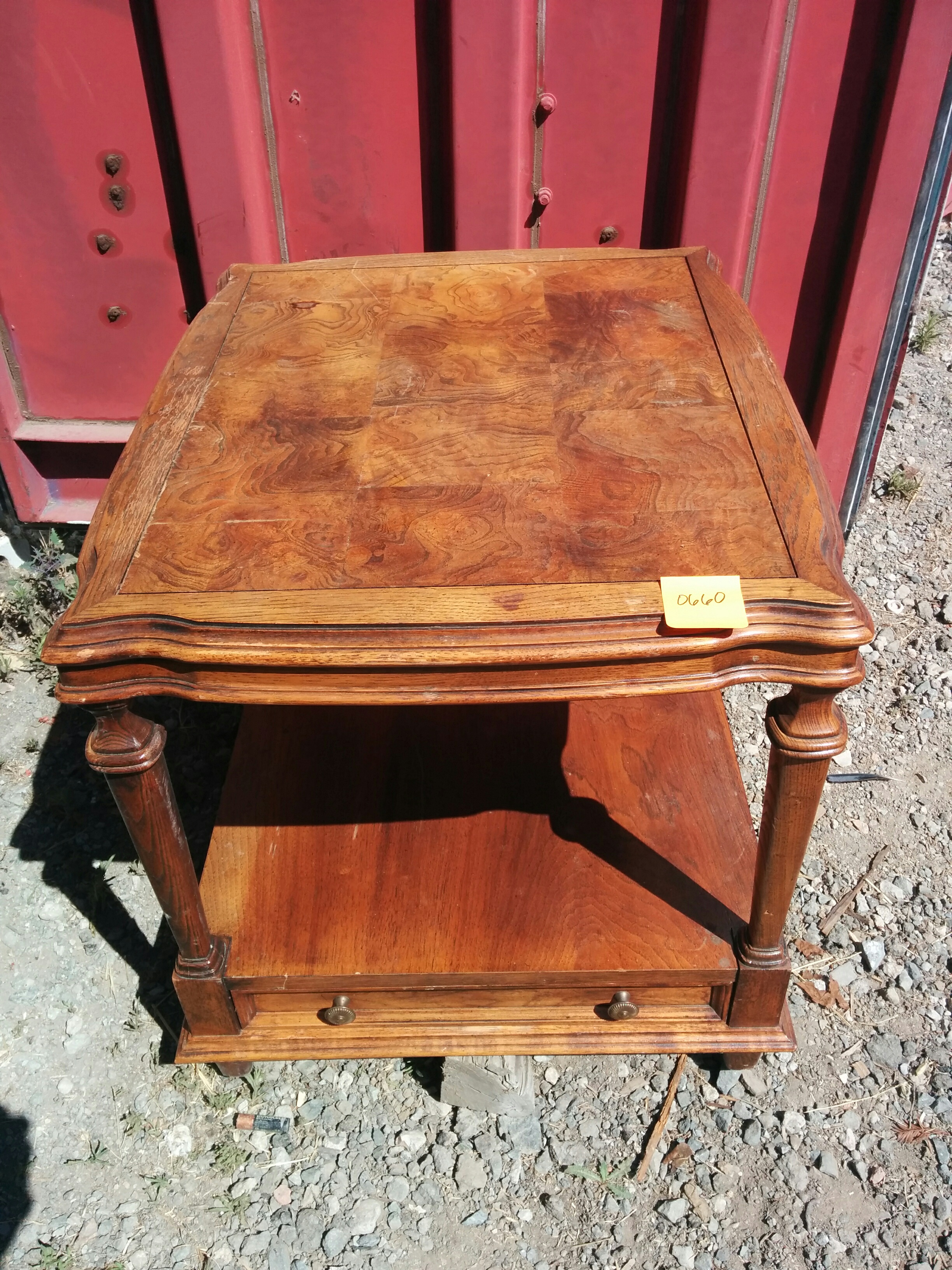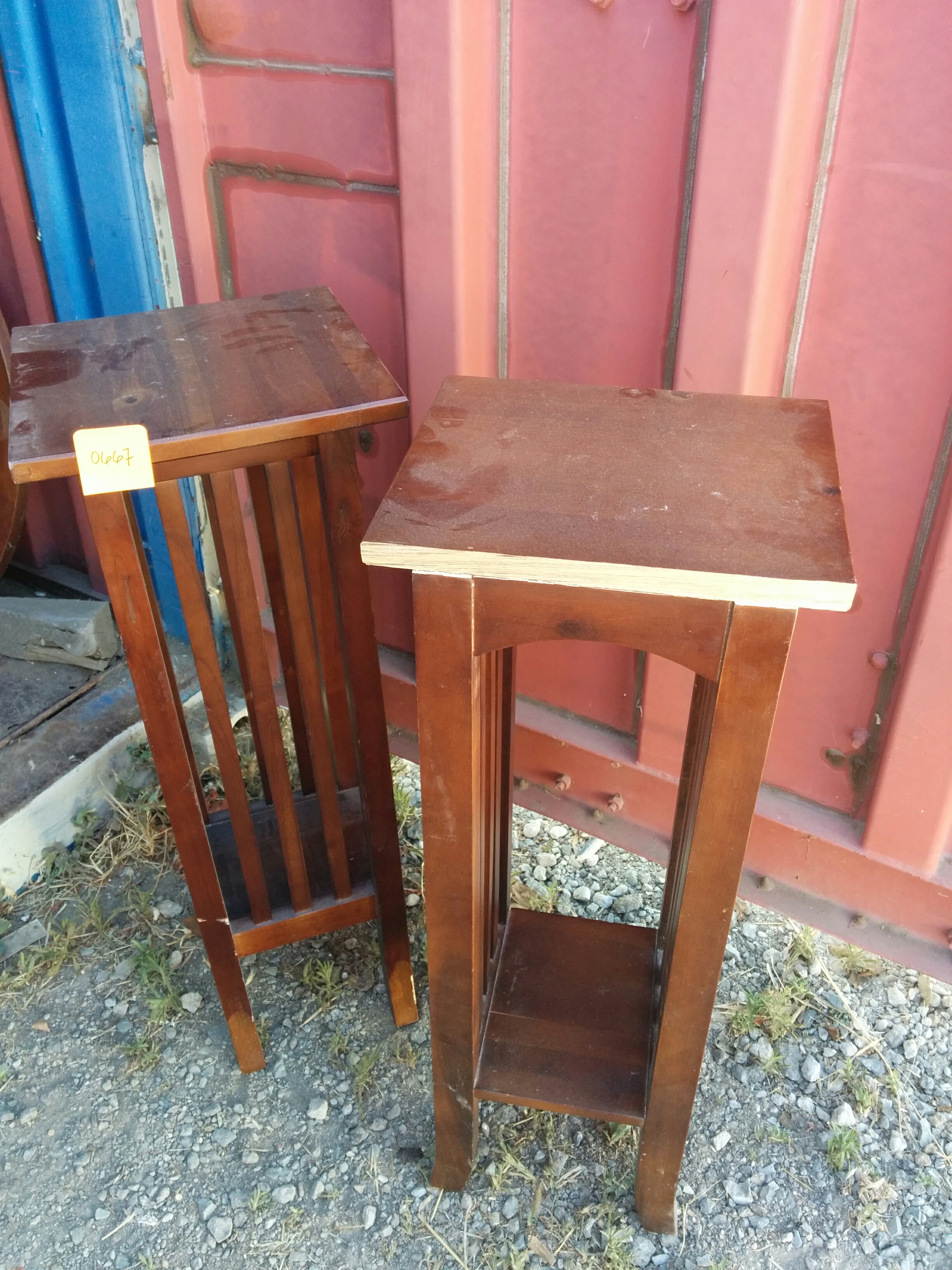 *SOLD* 0667 Matching Tall Stands SOLD One has a broken edge, otherwise good condition, solid. Tops can be replaced/covered with other wood. 32″H x 12″W x 12″ D