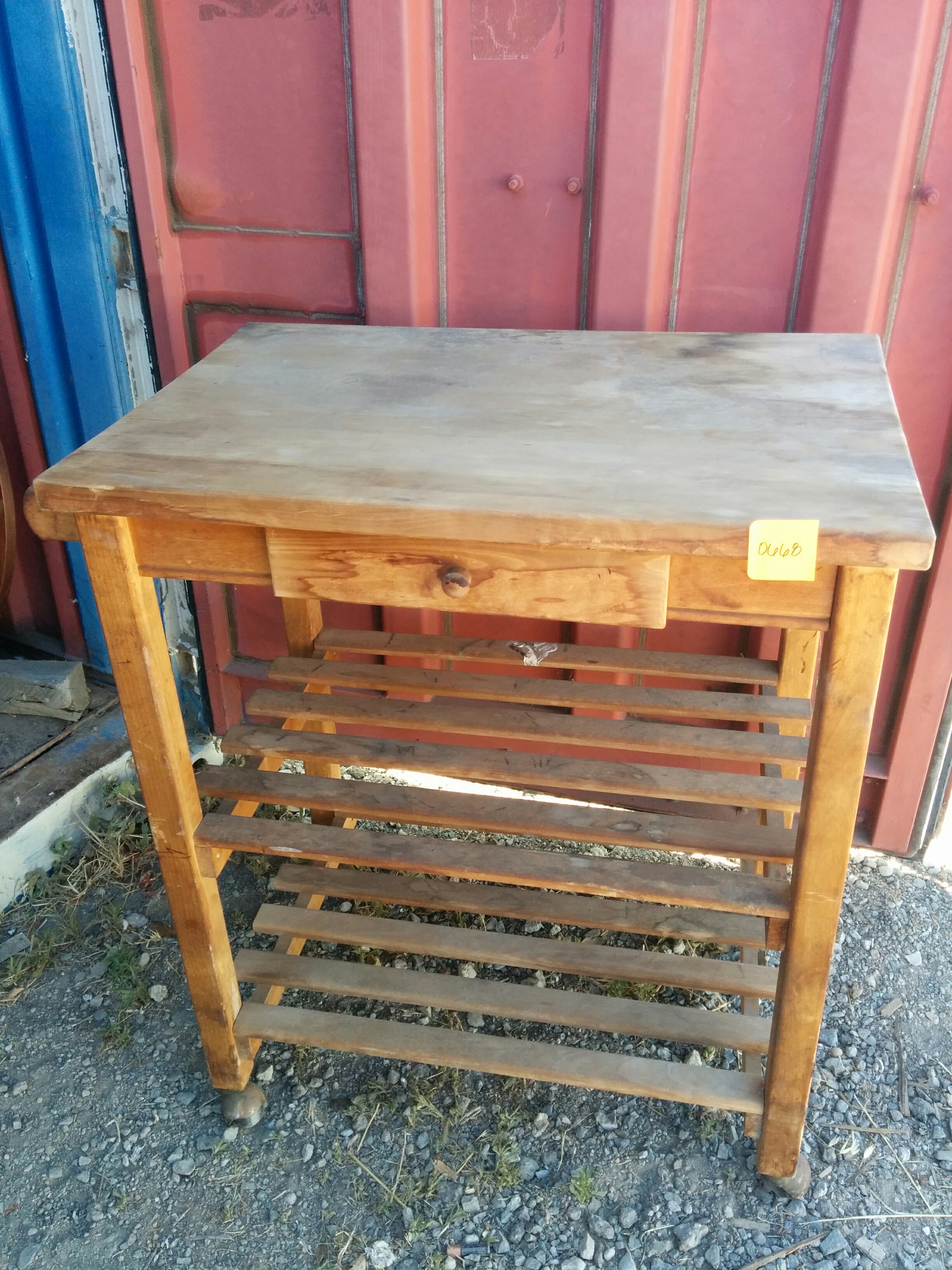 *SOLD* 0672 Baker’s Rack w Wood Shelves SOLD 64″H x 28″W – bottom wire shelf is 13″D – middle is missing the wood shelf (curved & 14″D) top shelves are 10″ D