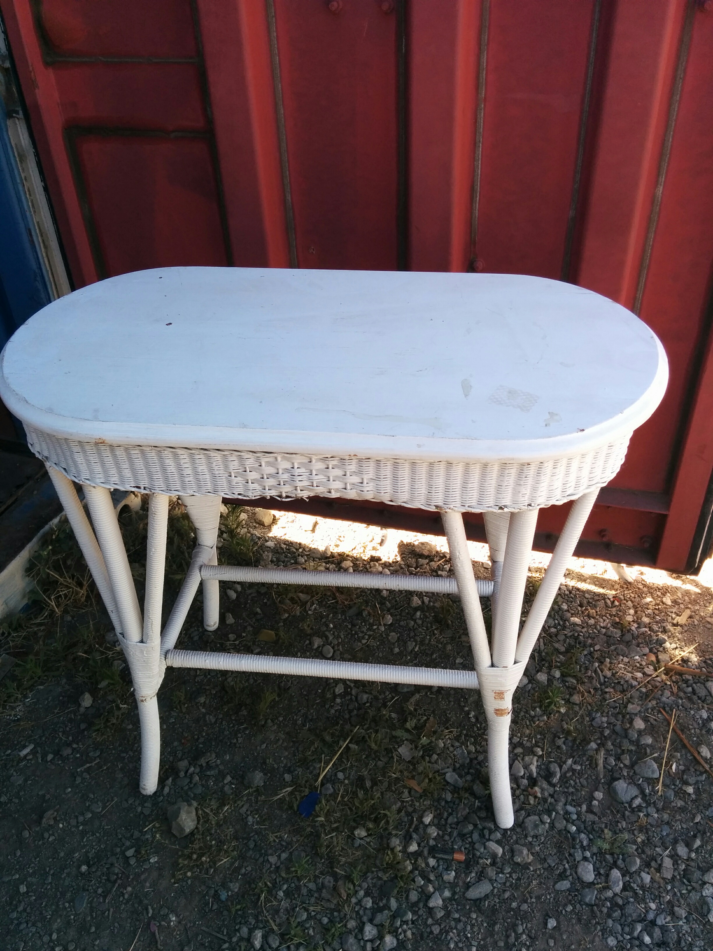 *SOLD* 0637 Small White Wicker Rectangular Table SOLD Seams showing thru wood top – needs paint 29″T x 21.5″W x 12.5″D