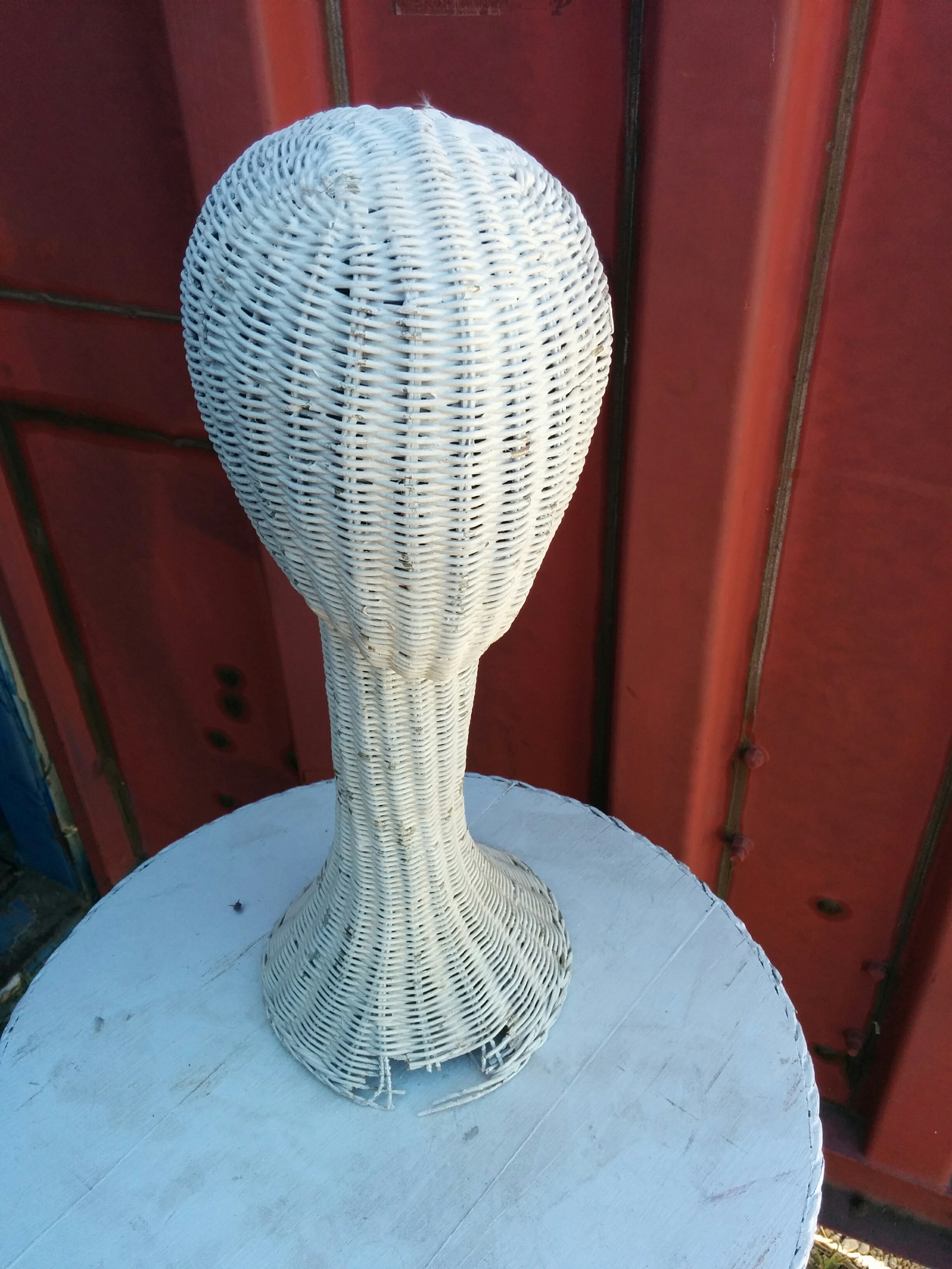 *SOLD* 0642 White Wicker Vase w Metal Base SOLD I think this is a vase of some kind. Bottom grape leaf motif is metal and fairly heavy. Sturdy. 22″T x 11″W