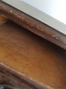 Furniture, SOLDSmall nick in the back and what seems to be a burn on top. The burn is just a dark mark there is no indentation on the wood. Otherwise in very good condition. You can tell by the wheels that it is old. There is no key but you can turn the lock with your finger. Very unique piece. 33.5″H x 25.5″W x 16″D