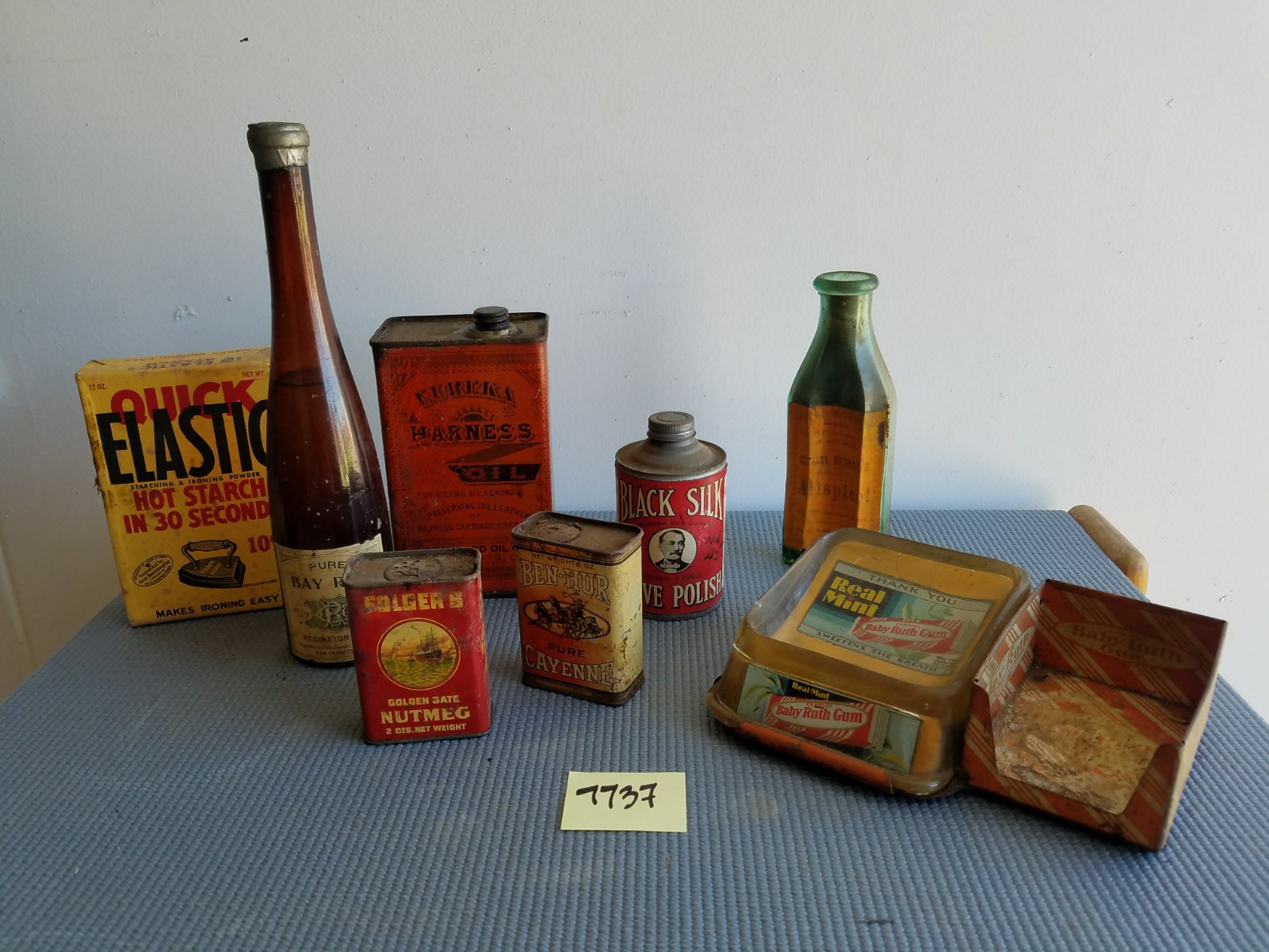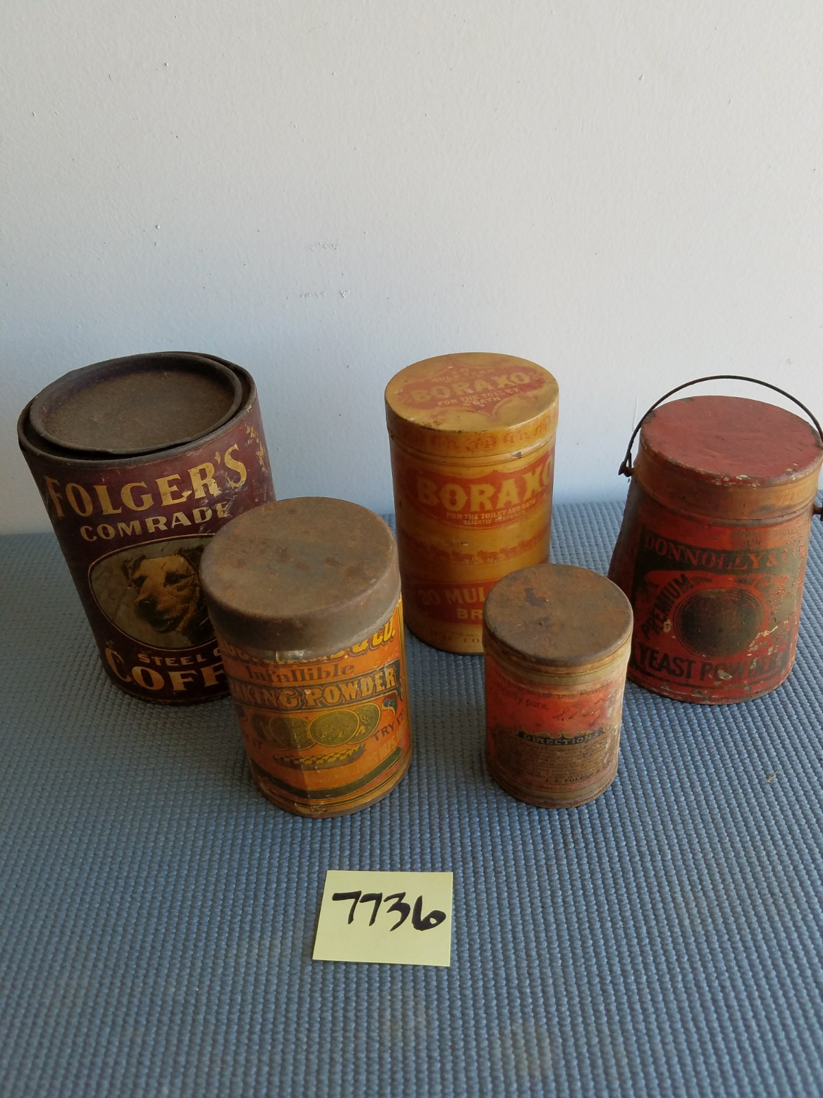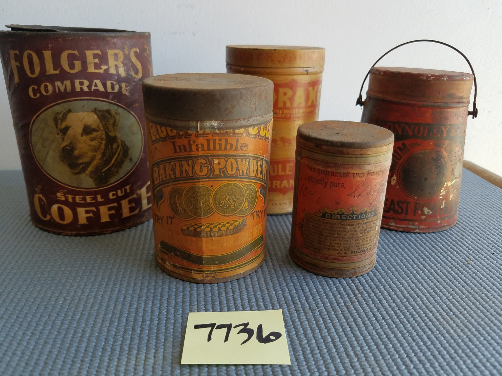 *SOLD*7736 Cool Metal Canisters & Jars SOLD Folgers Steel Cut Coffee is 6″ Tall x 4″D & Donnolly & Co Yeast Powder is 5″H – Some are no longer available.